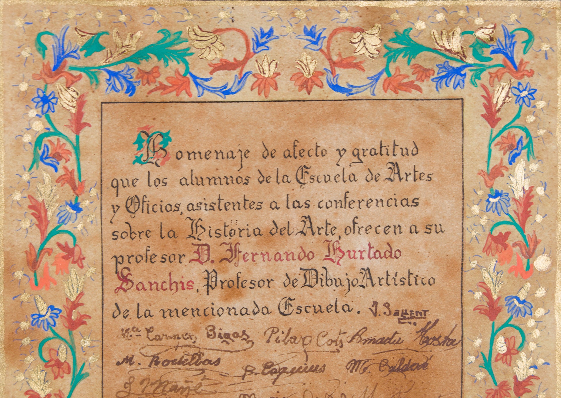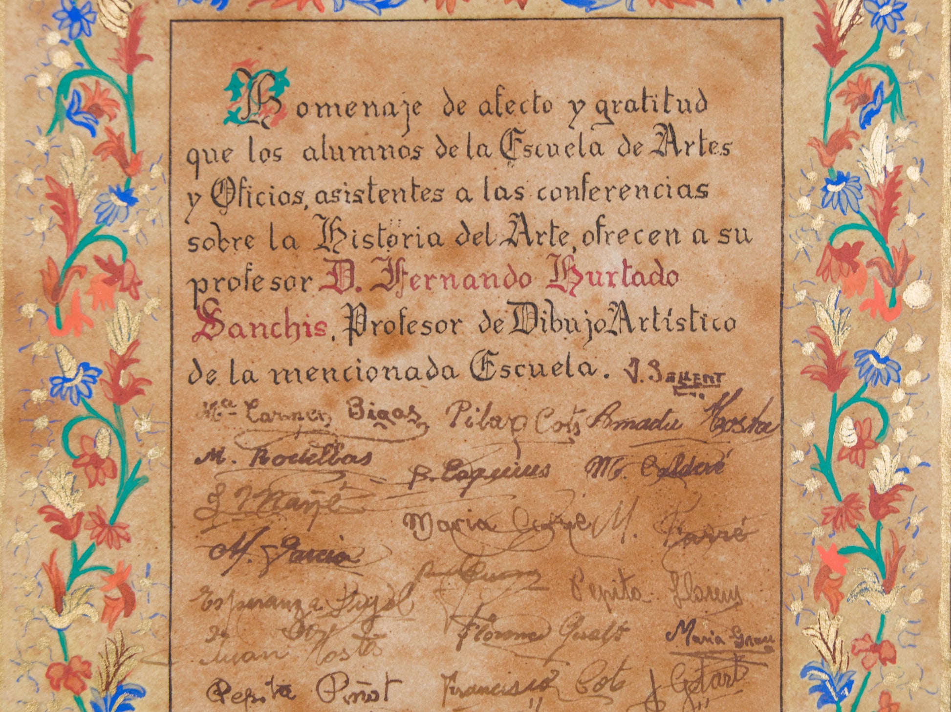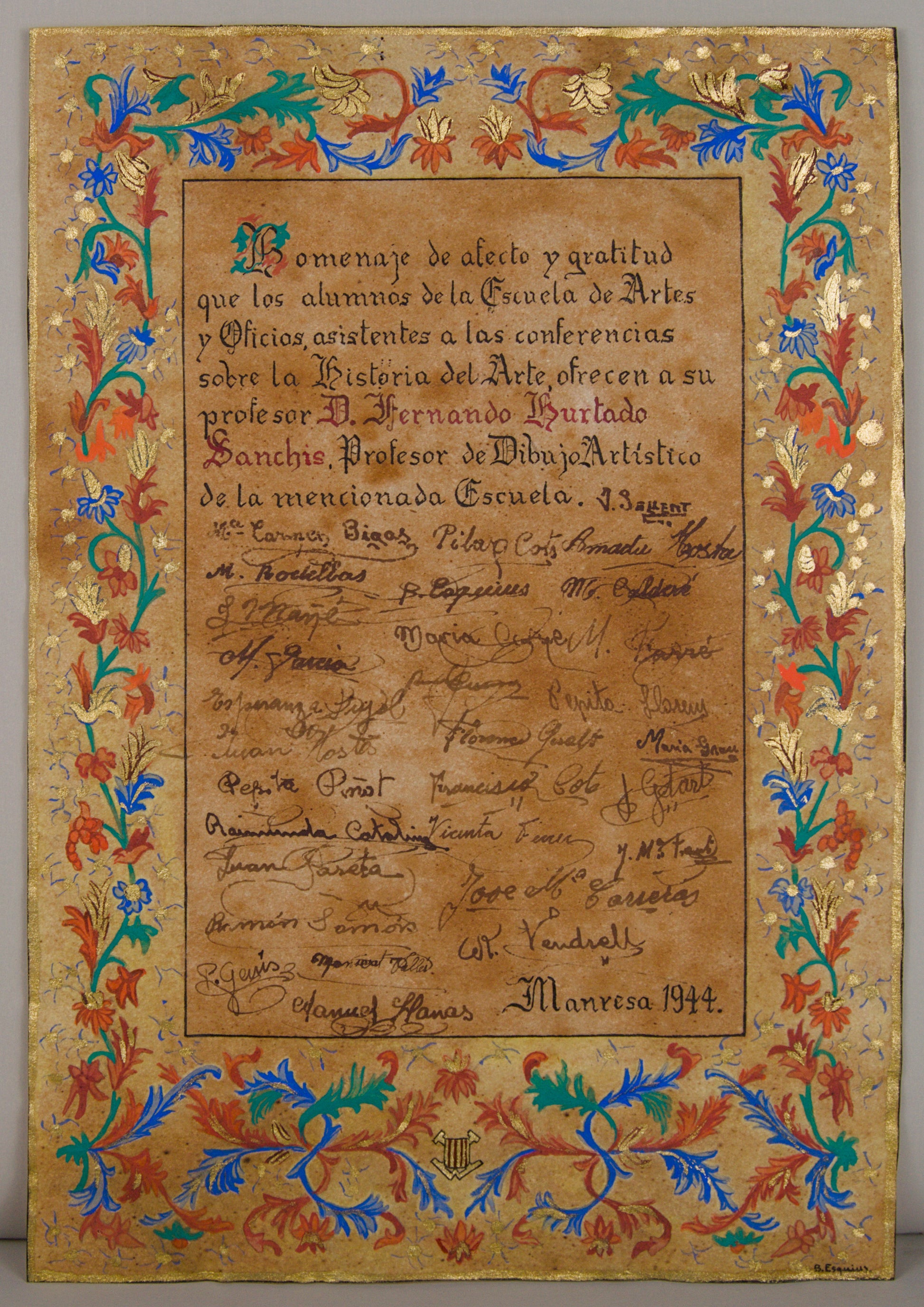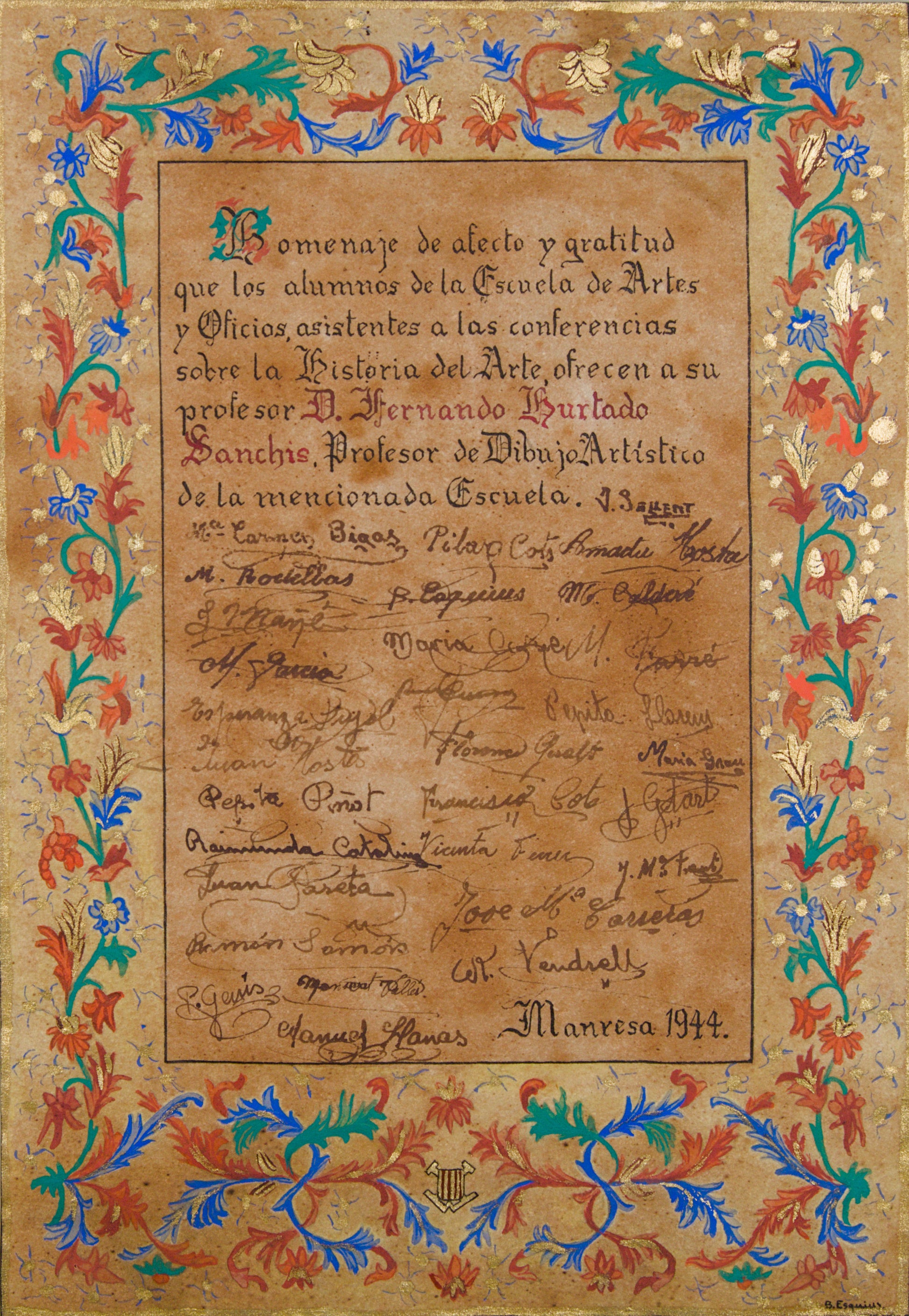 Firma e Inscripciones: Firmado por el iluminador "B. Esquius" en el ángulo inferior derecho. Texto caligrafiado y múltiples firmas autógrafas originales de los alumnos.