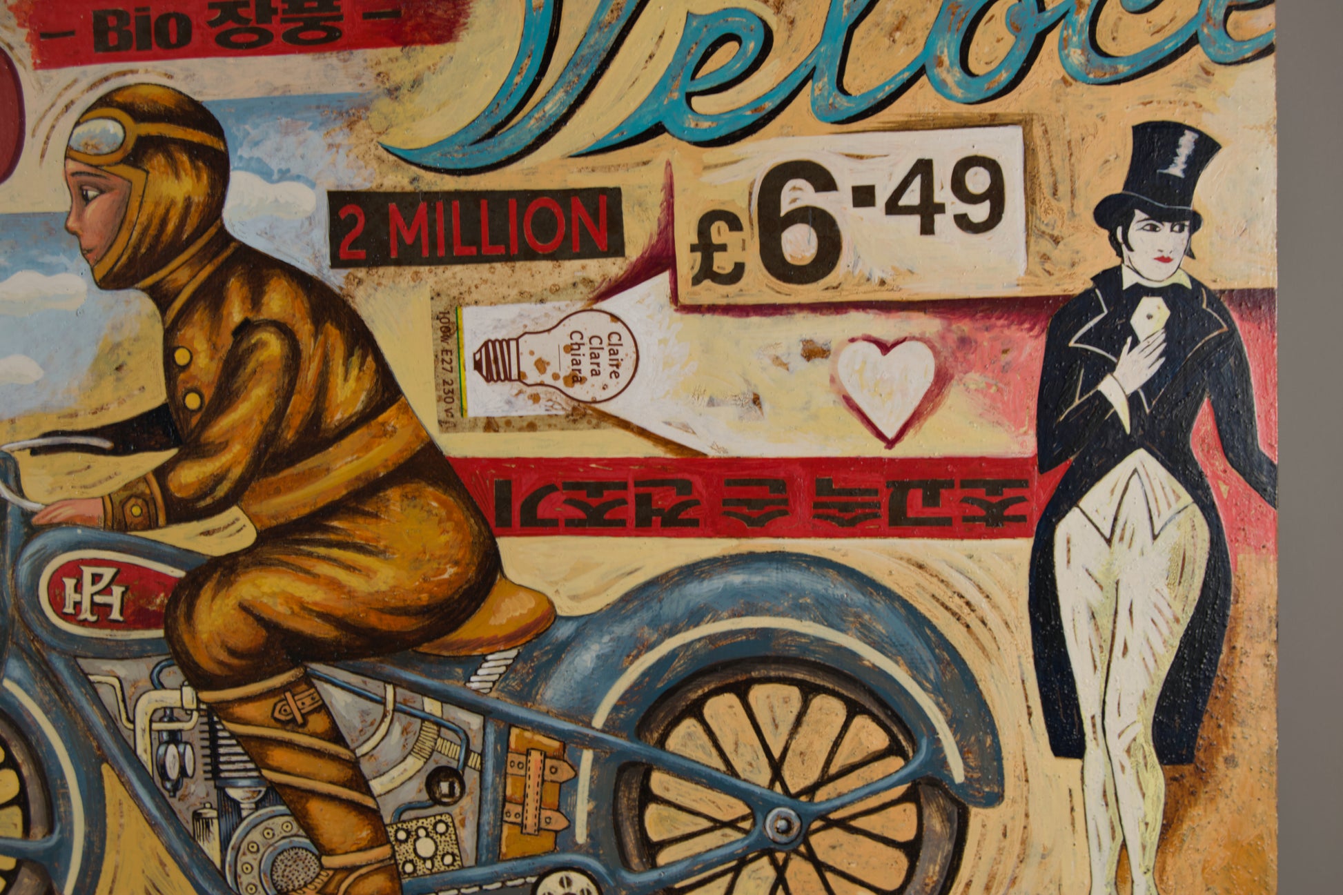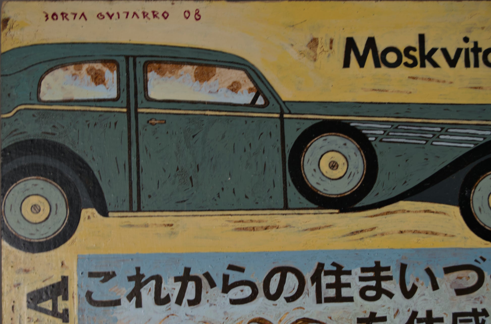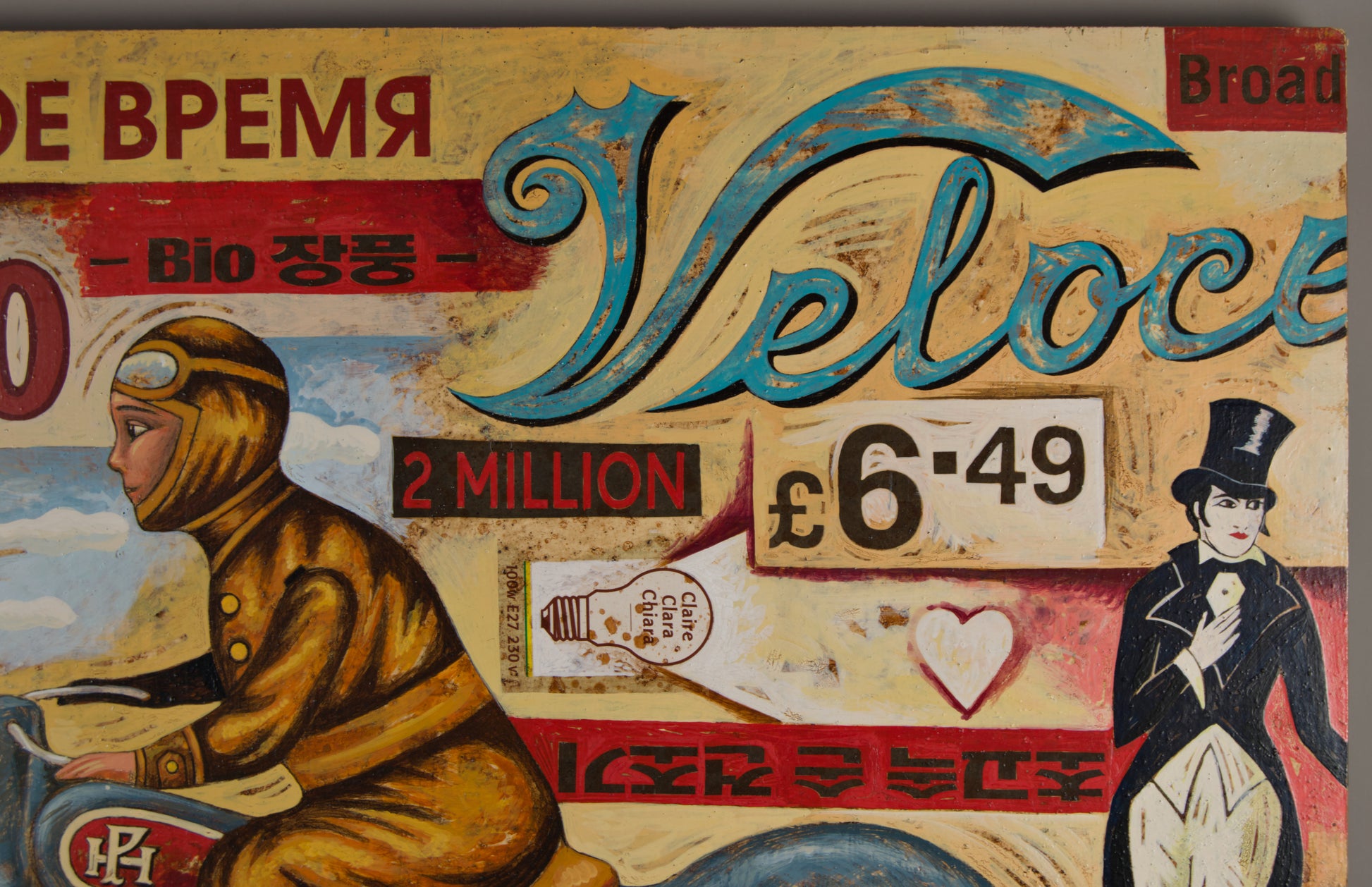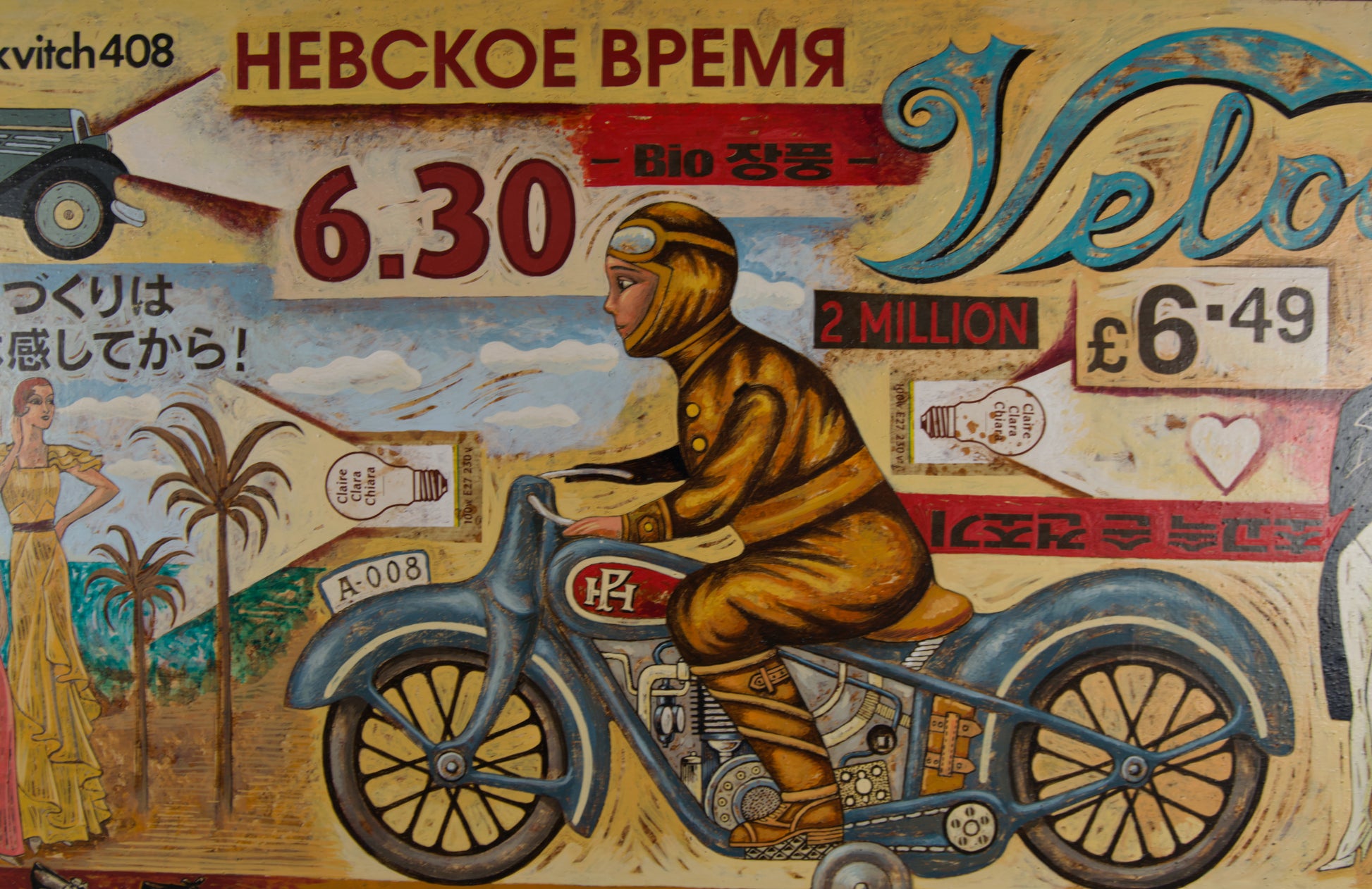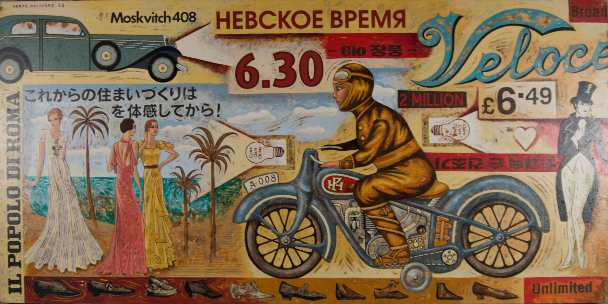Motorische Ikonografie: Das große Motorrad „Veloce“ (mit einem Fahrer in Vintage-Lederkleidung) dominiert die rechte Seite und wird links vom sowjetischen Auto „Moskwitsch 408“ ausbalanciert. Es ist eine Hommage an Geschwindigkeit und klassische Ingenieurskunst.