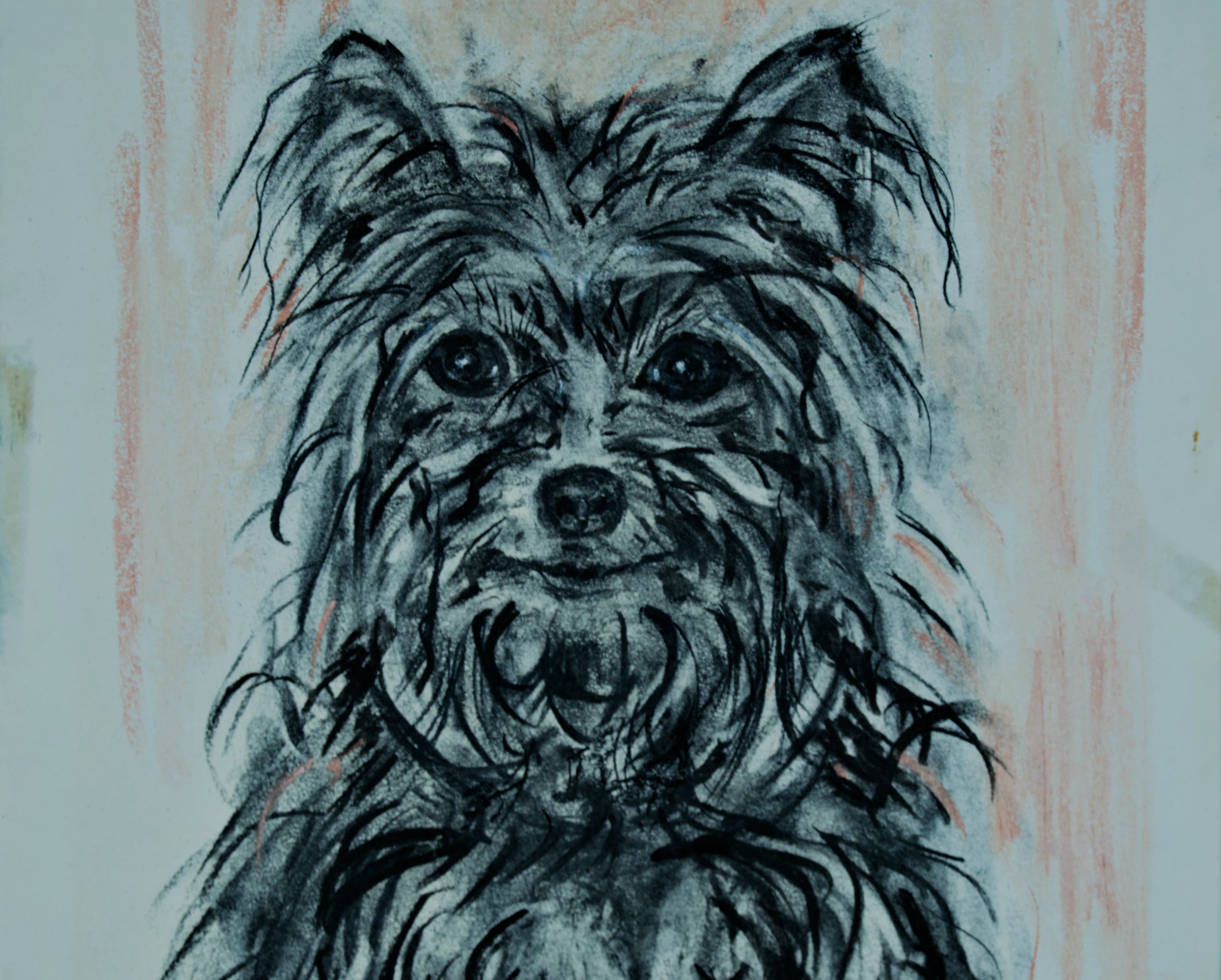 Visuelle Analyse: Die Textur des Fells. Das Auffälligste an diesem Werk ist, wie der Künstler die technische Schwierigkeit des Fells meistert. Anstatt Haar für Haar zu zeichnen, verwendet Malfeito einen sehr gestischen, schnellen und dynamischen schwarzen Strich (Kohle oder Fettstift). Diese kontrollierten Striche erzeugen die perfekte Illusion der zotteligen, wilden Textur, die typisch für Yorkshire Terrier ist.