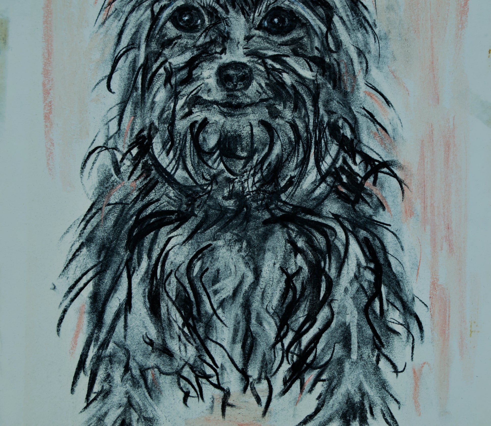 Malfeito hat keinen „Ausstellungshund“ gemalt, sondern einen echten Hund, etwas zerzaust, mit diesem aufmerksamen Blick eines Hundes, der auf ein Leckerli oder einen Spaziergang wartet. Mir gefallen die Klebebandspuren an den Rändern; sie erzählen die Geschichte, wie dieses Papier an der Staffelei des Malers befestigt wurde, während das Modell unruhig posierte. Mit einem guten Passepartout, das die Ränder abdeckt, wird es zu einem fantastischen Werk.