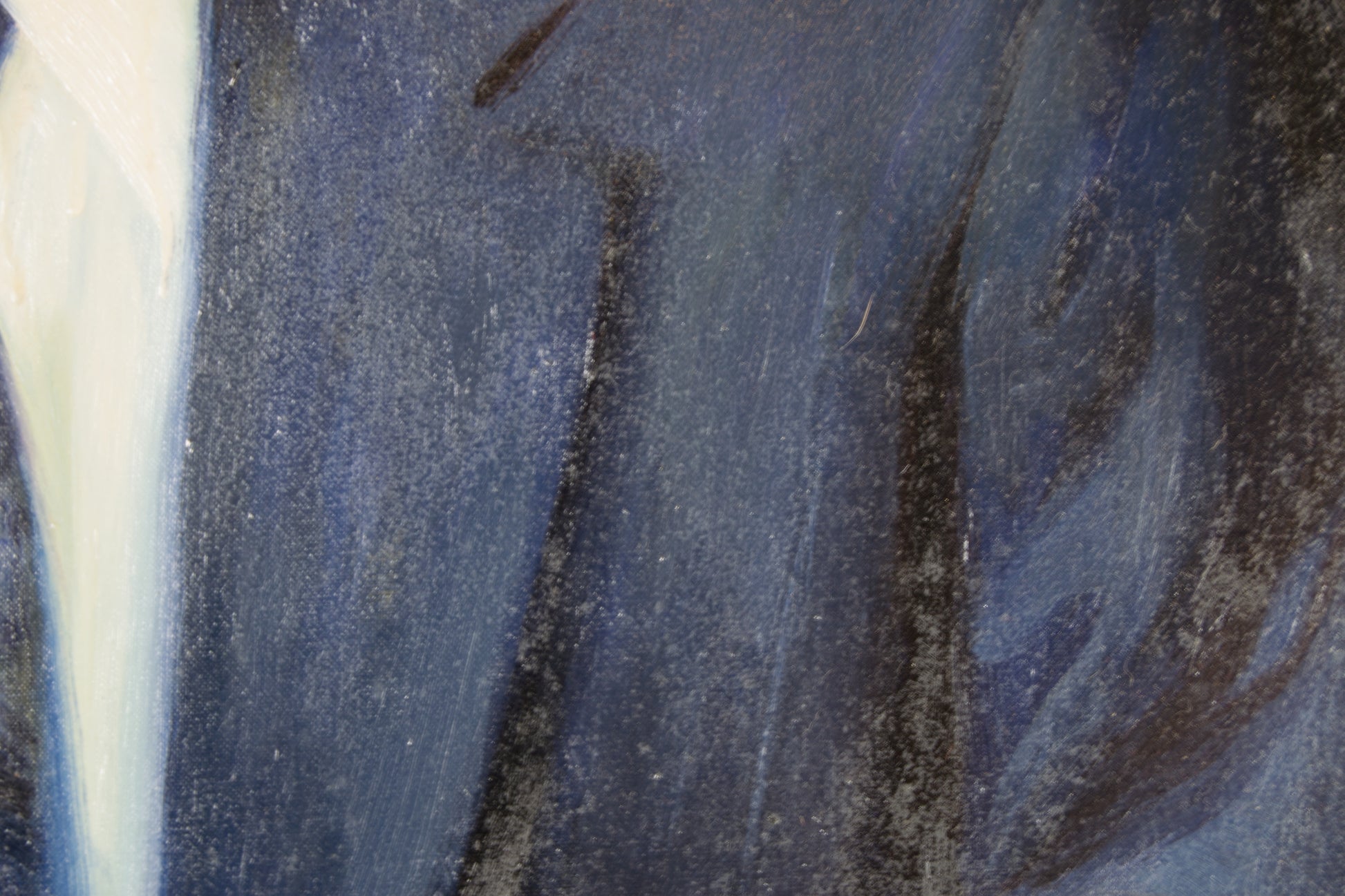 Die Farbpalette und das Licht: Der Künstler nutzt die Hell-Dunkel-Malerei meisterhaft, um die Aufmerksamkeit ganz auf die Figur zu lenken. Vor einem neutralen, dunklen Hintergrund tritt das Subjekt hervor, umhüllt von einem warmen, gerichteten Licht, das seine Gesichtszüge und vor allem seinen intelligenten und freundlichen Ausdruck betont. Die Farbpalette ist zurückhaltend und raffiniert, dominiert von den Schwarz-, Blaugrau- und Cremetönen der Kleidung, wodurch die warmen Hauttöne besonders gut zur Geltung kommen. Das Licht erhellt nicht nur, sondern definiert auch den Charakter und die Psychologie des Dargestellten.