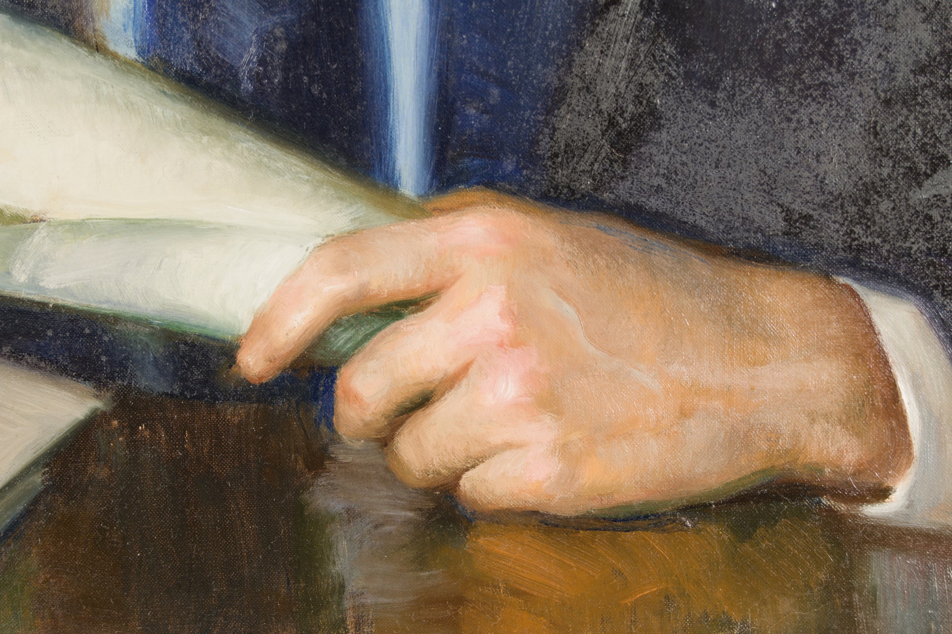 Komposition und Technik: Ribera Gómez beweist hier sein ganzes akademisches Können, das er der großen spanischen Porträttradition verdankt. Die Dreiviertelansicht des sitzenden Porträtierten ist von klassischer Eleganz. Der Pinselstrich ist präzise und zurückhaltend, aber dennoch voller Weisheit: Dies zeigt sich in der Wiedergabe der Gesichtszüge, in der Modellierung der Hände – ein wahres Meisterwerk der Zeichenkunst und Farbgebung – und in der erstaunlichen Fähigkeit, Texturen zu differenzieren. Der Stoff des Anzugs, der subtile Glanz der Seidenkrawatte und die matte Beschaffenheit des Papiers, das er in Händen hält, sind allesamt mit makelloser technischer Fertigkeit wiedergegeben.