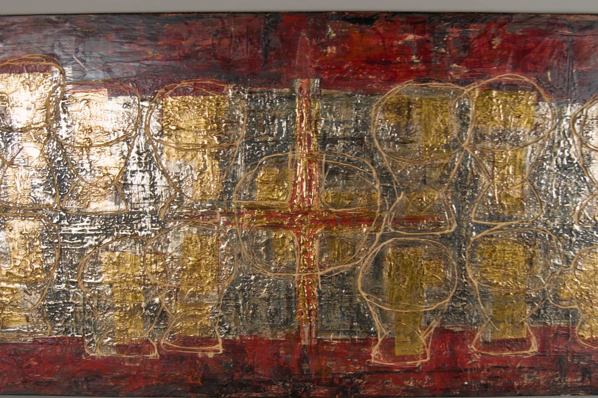 Dieses Werk beeindruckte mich durch seine physische Präsenz. Es ist kein Gemälde, das man betrachtet, sondern ein Objekt, das man fühlt. Berührt man die Oberfläche, spürt man die Rillen, die Farbschichten, das Holz… Vila Rufas behandelte die Malerei wie antike Goldstickerei. Ich wählte es wegen seines radikalen Panoramaformats und weil das verwendete Gold nicht einfach nur Glitzer ist; es ist ein altes, würdevolles Gold, das je nach Lichteinfall völlig seine Farbe verändert. Es ist perfekt für jemanden, der ein Werk mit historischer und spiritueller Bedeutung sucht, ohne in die klassische Figuration abzurutschen.