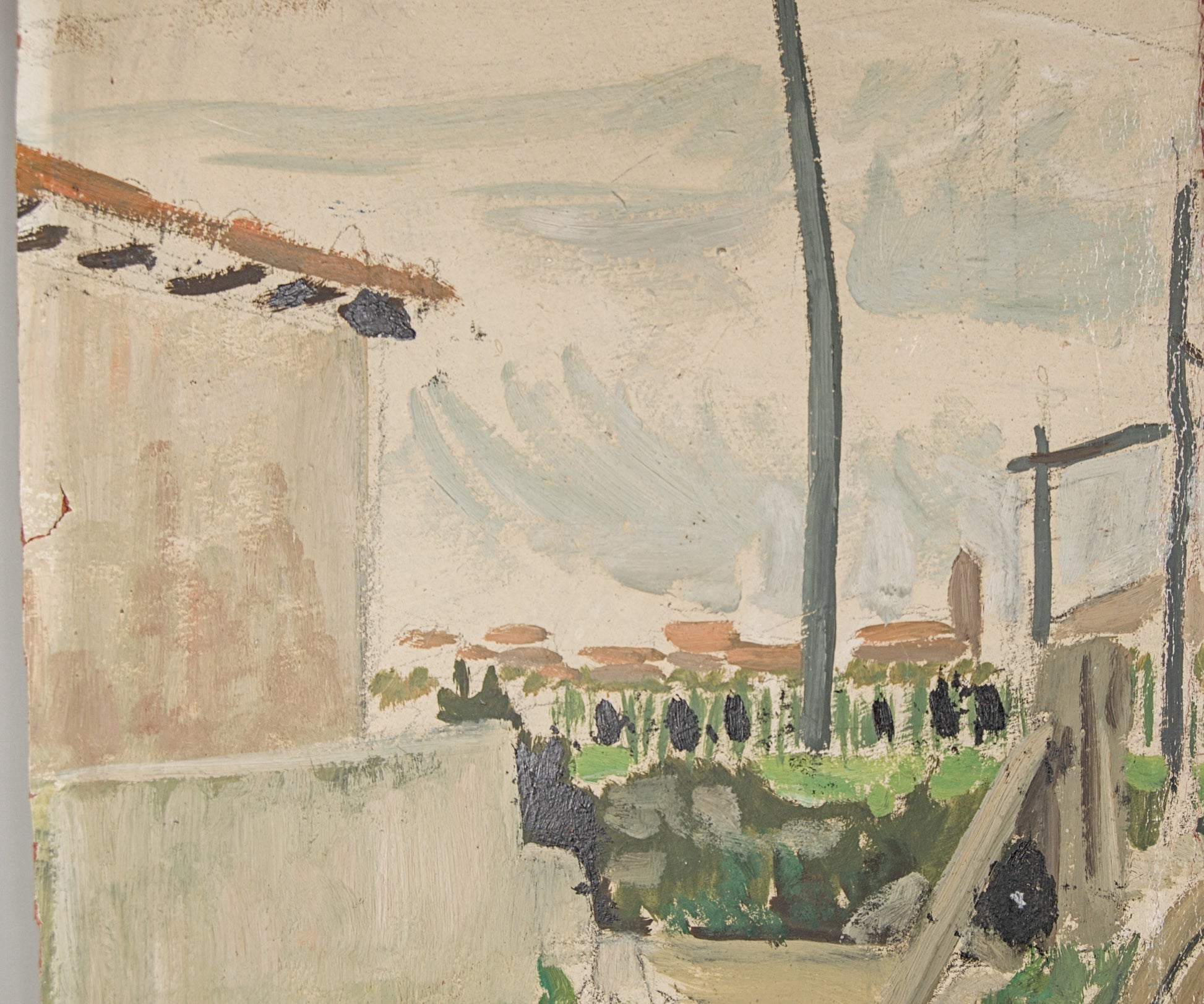 JOSEP AMAT PAGÈS | PAISAJE DE LAS AFUERAS | DÍPTICO PANORÁMICO | ÓLEO SOBRE TABLA