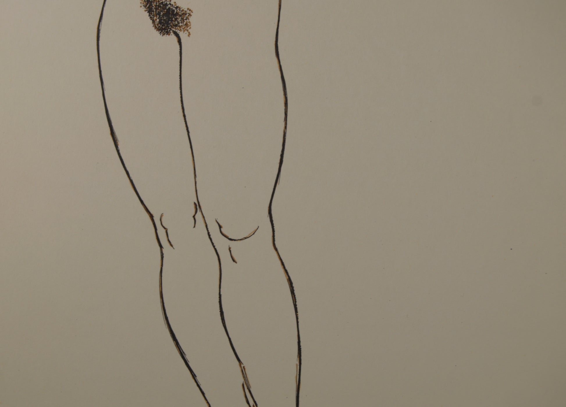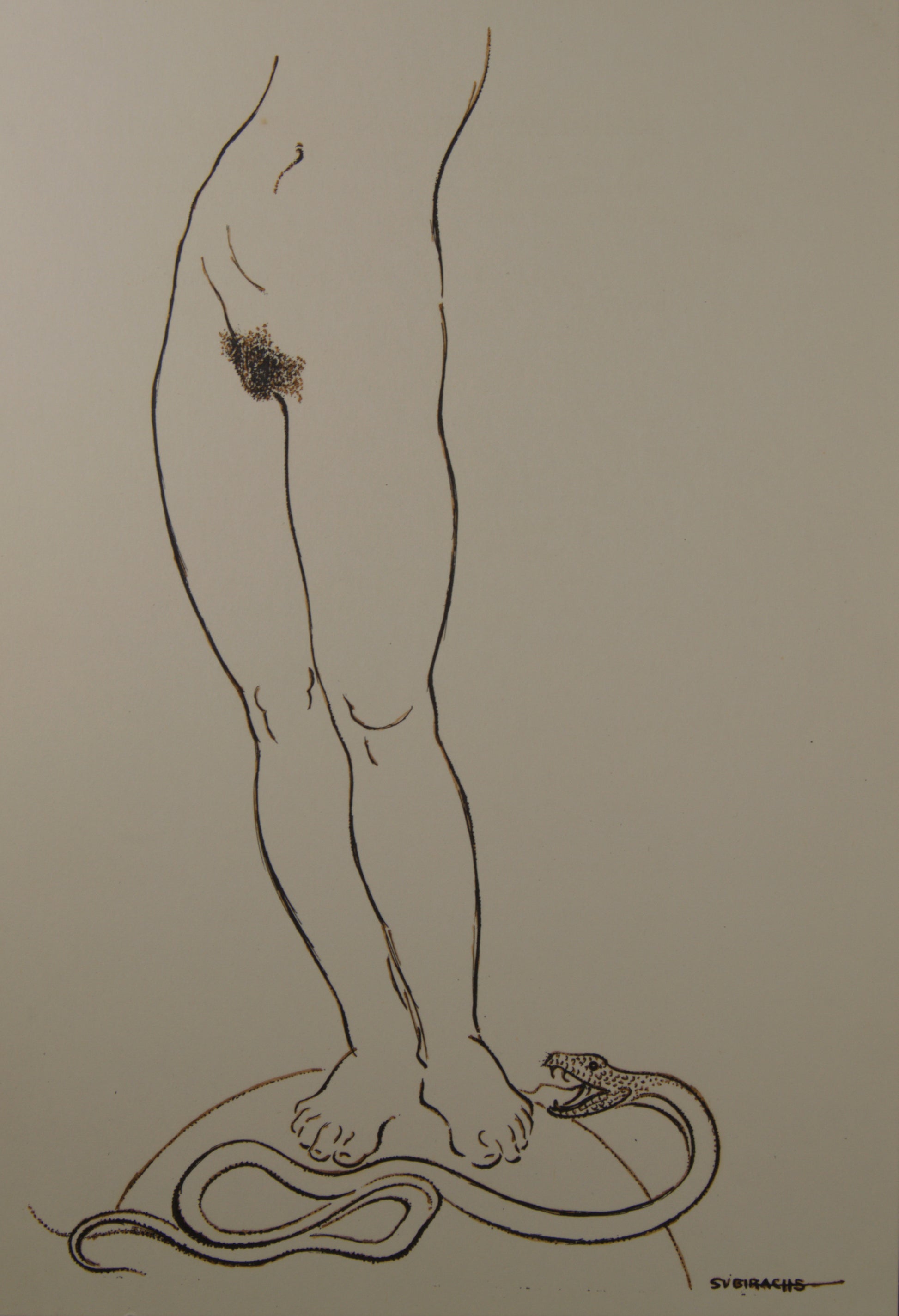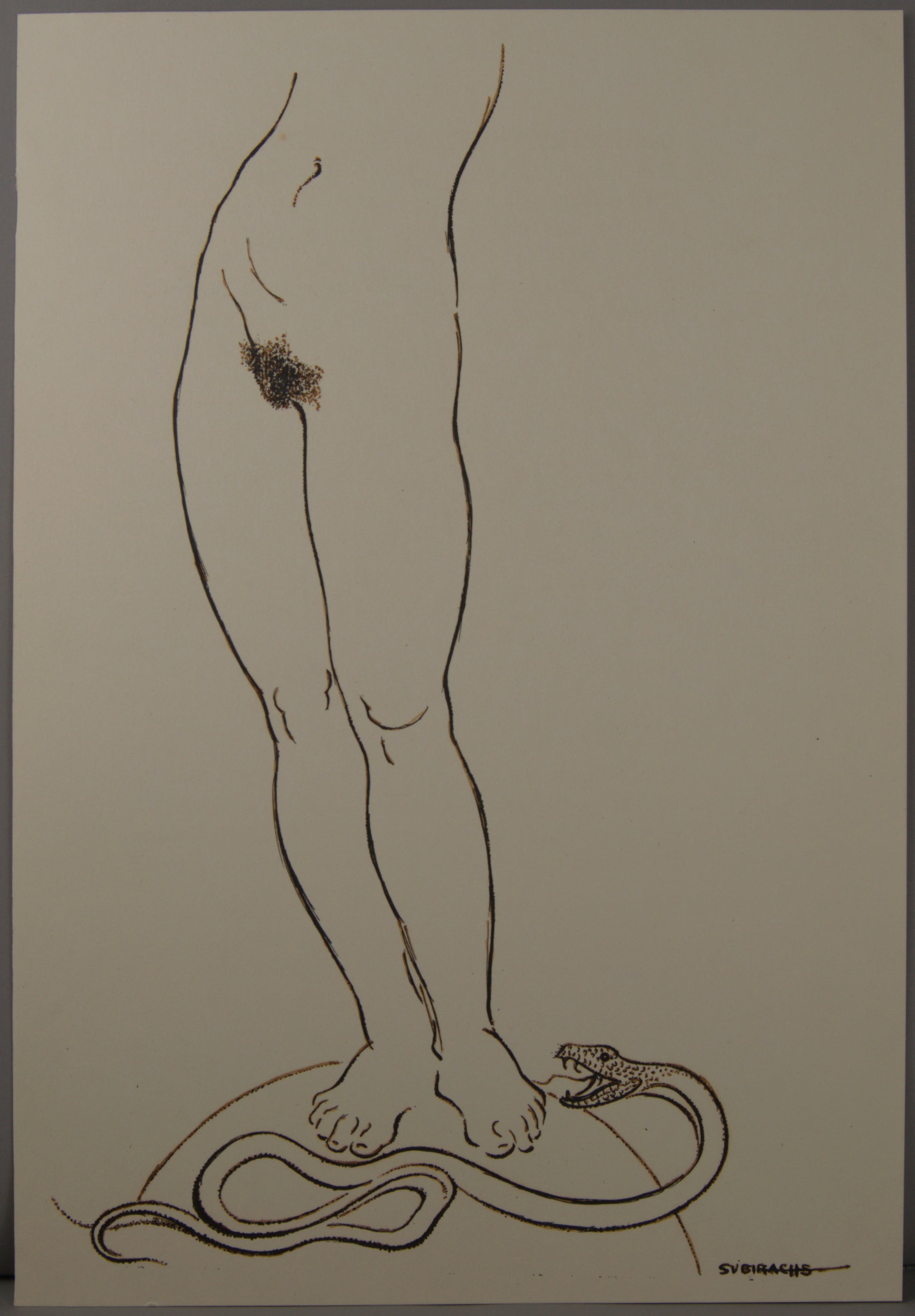 En este original a tinta, Subirachs aborda uno de los grandes arquetipos de la historia del arte: el mito de Eva y el Pecado Original. Lejos de la pesadez de la piedra, el maestro utiliza un trazo de tinta continuo, firme y de un grosor modulado para delimitar la sensual anatomía de la mitad inferior de una figura femenina desnuda.
