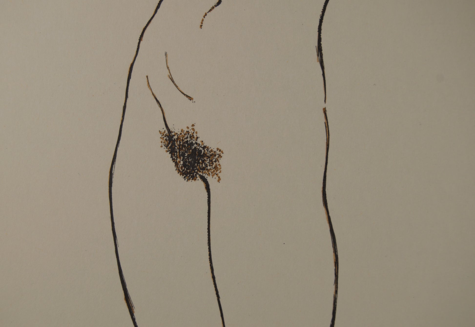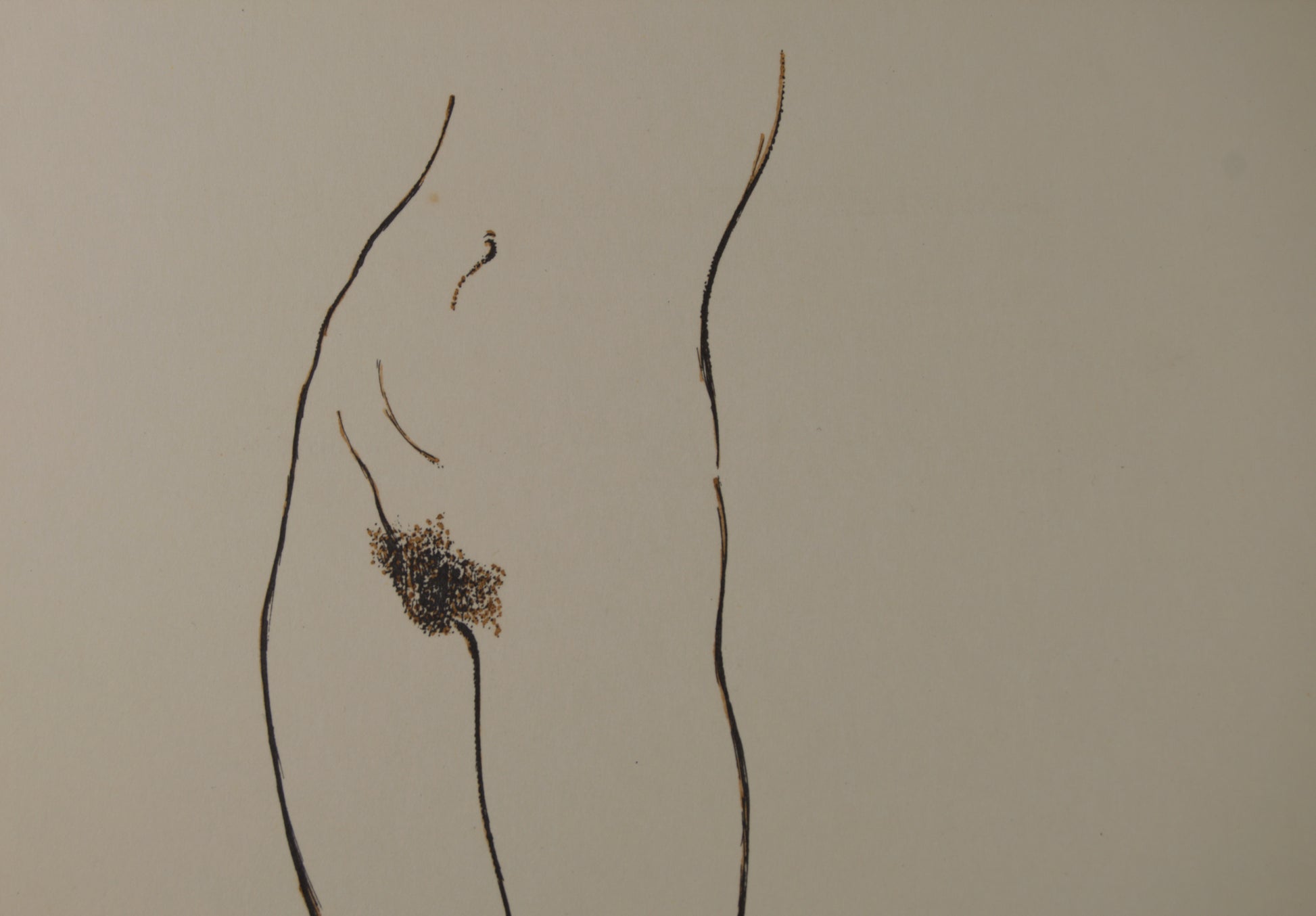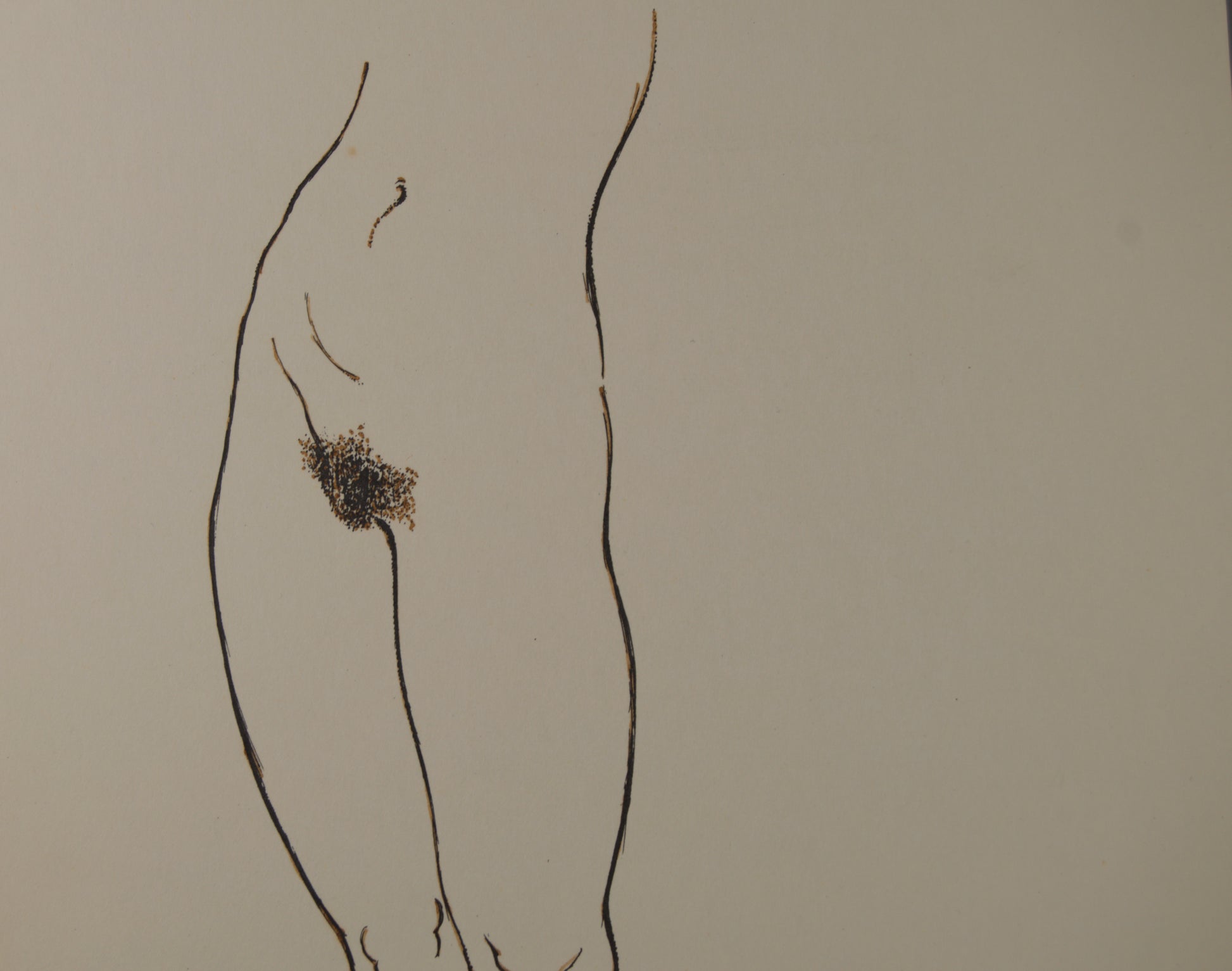 En este original a tinta, Subirachs aborda uno de los grandes arquetipos de la historia del arte: el mito de Eva y el Pecado Original. Lejos de la pesadez de la piedra, el maestro utiliza un trazo de tinta continuo, firme y de un grosor modulado para delimitar la sensual anatomía de la mitad inferior de una figura femenina desnuda.