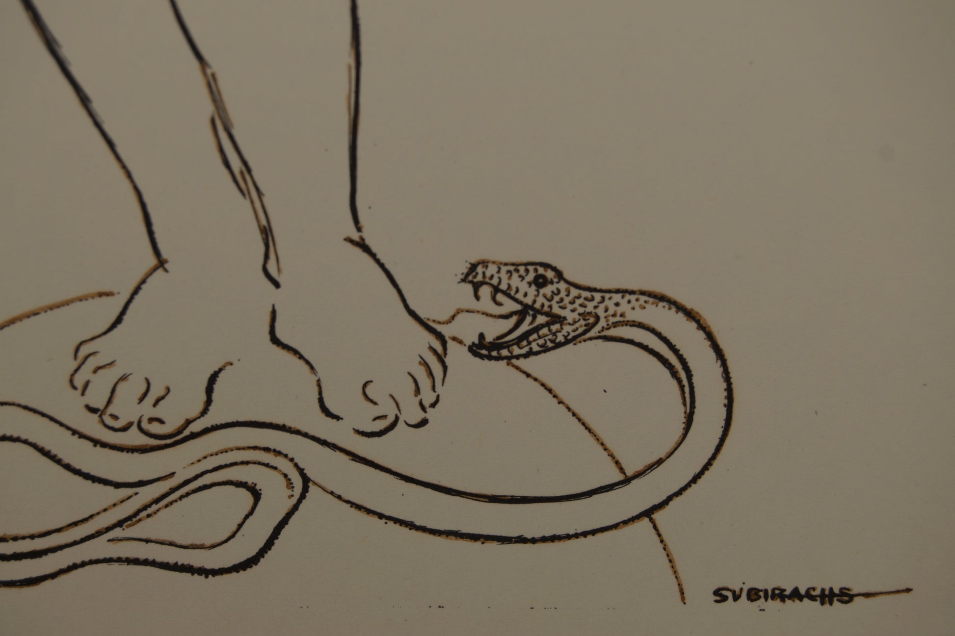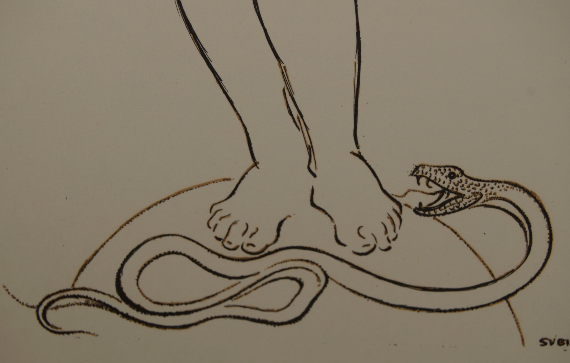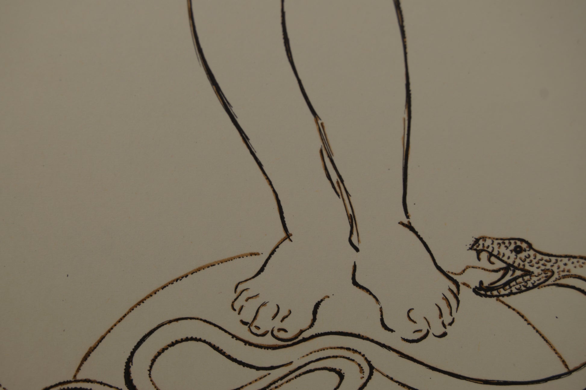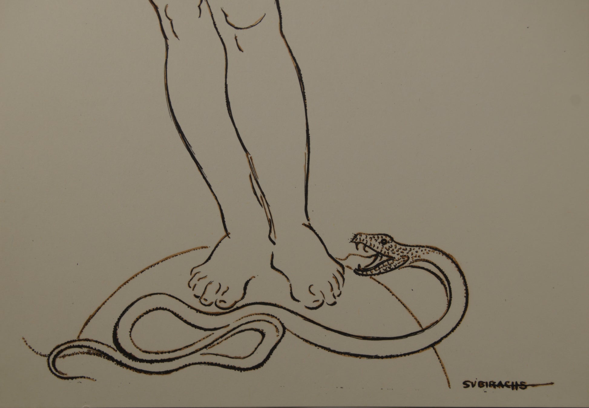 La composición es un triunfo del minimalismo y la iconografía. La figura se erige grácilmente sobre un fragmento de esfera (símbolo del mundo o la perfección), mientras que a sus pies, trazada con la misma exactitud milimétrica, una serpiente con las fauces abiertas se desliza amenazante. Subirachs no necesita fondos, ni sombras, ni aguadas dramáticas; el magistral uso del "espacio negativo" (el blanco del papel) y la precisión de la línea son suficientes para otorgar a la figura un volumen escultórico y una presencia magnética.