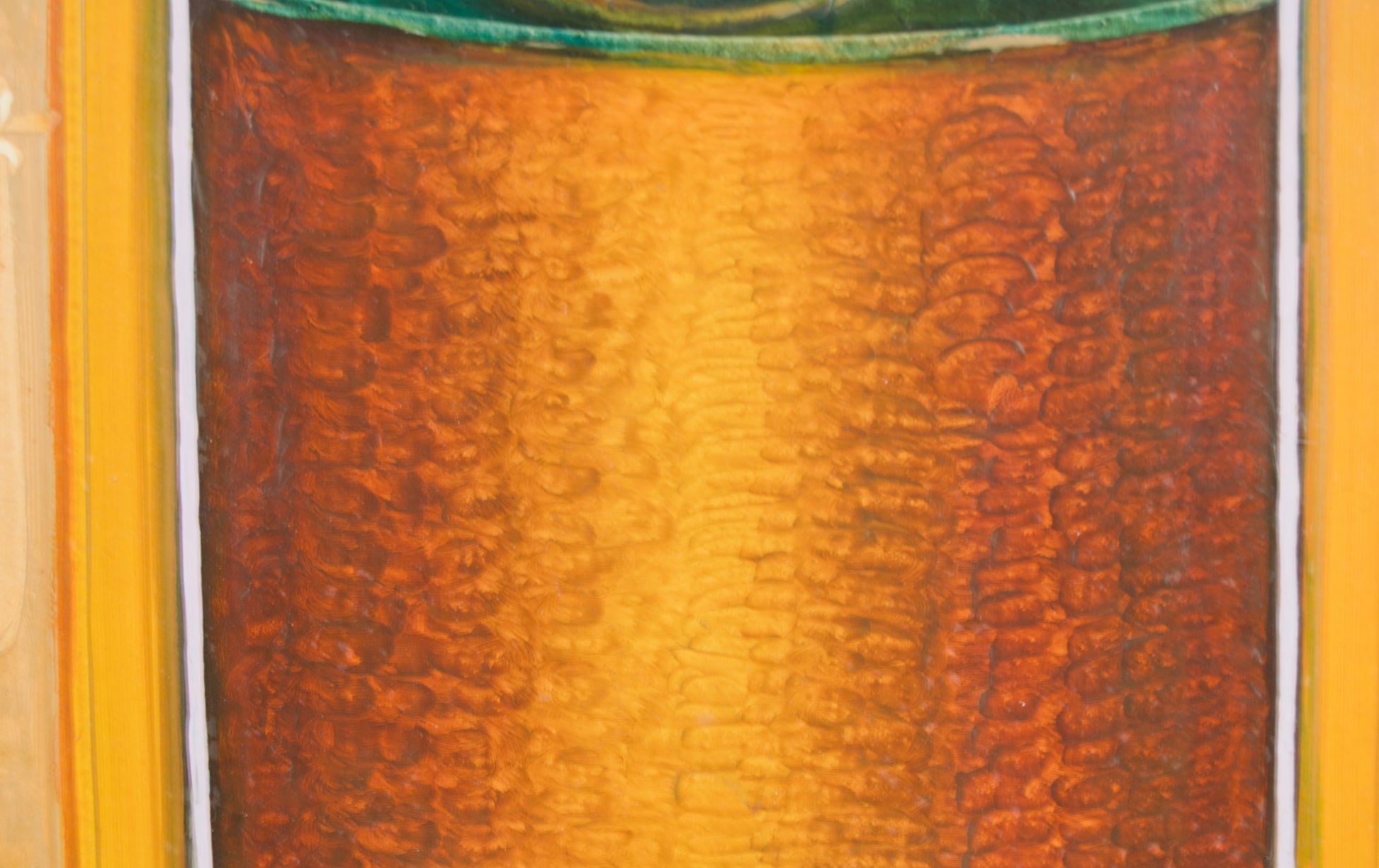 Erhaltungszustand: Gut. Die Steifigkeit der Plattenunterkonstruktion begünstigt die Stabilität der Farbschicht.