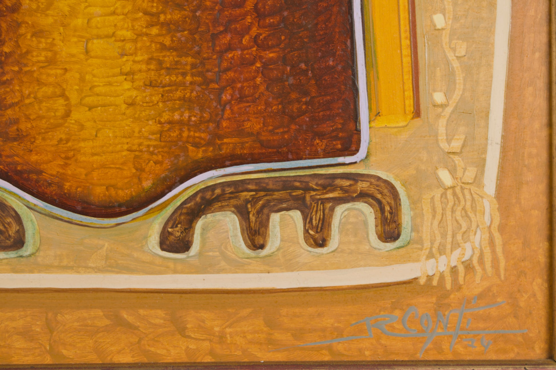 Ein Werk von Raúl Conti zu besitzen bedeutet zu verstehen, dass Kunst eine Sprache ist. Ich bin immer wieder erstaunt darüber, wie dieser Künstler weder eine Vase noch einen Poncho kopieren muss, um uns in seinen Arbeiten „Amerika“ spüren zu lassen; er erreicht dies durch den Rhythmus von Formen und Farben. Es ist ein Werk für Sammler, die Struktur und visuelle Ordnung suchen, aber nicht die Kälte reiner Abstraktion wünschen. Es hat Seele, es ist erdverbunden, aber es ist mit dem Blick eines Architekten gemalt.