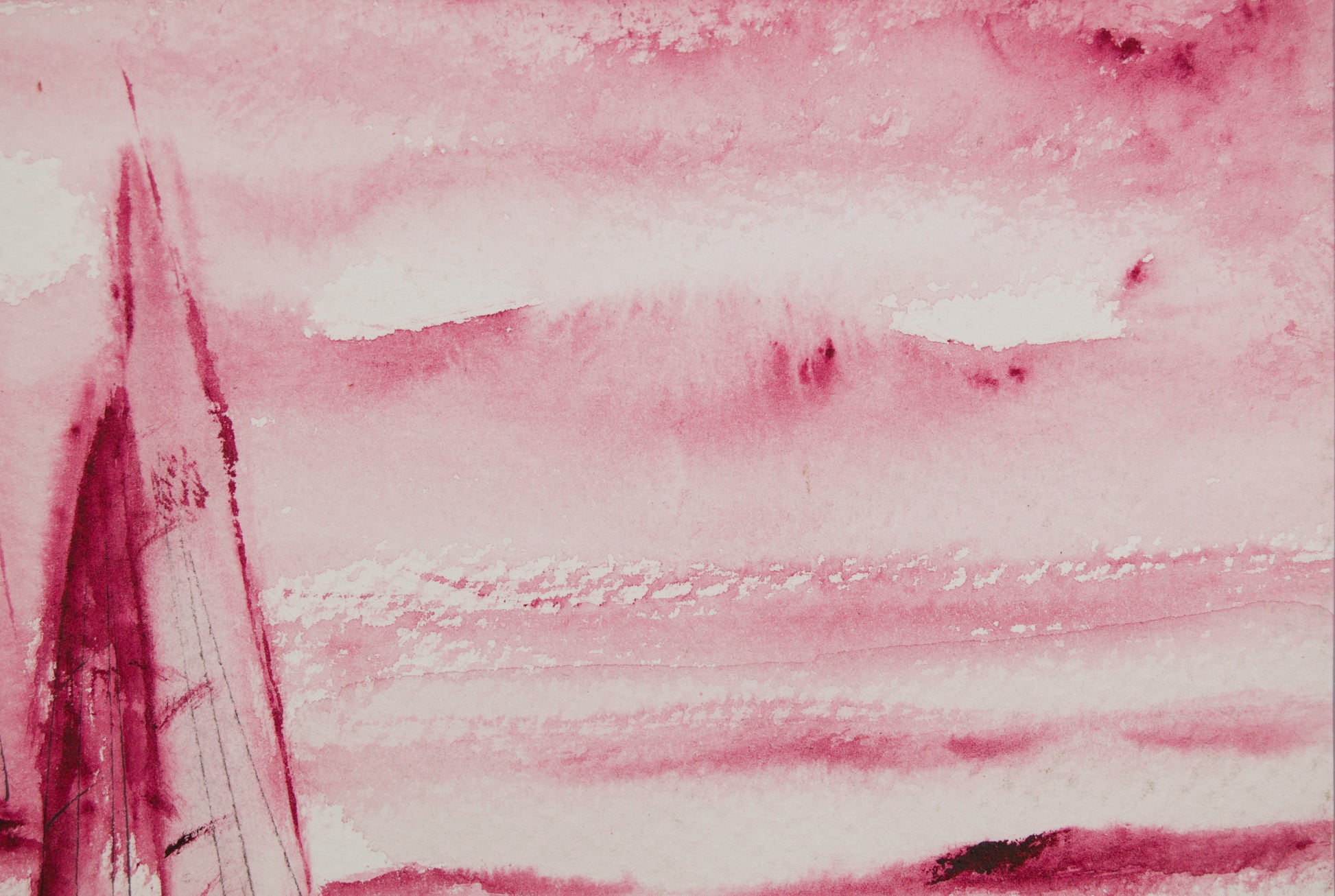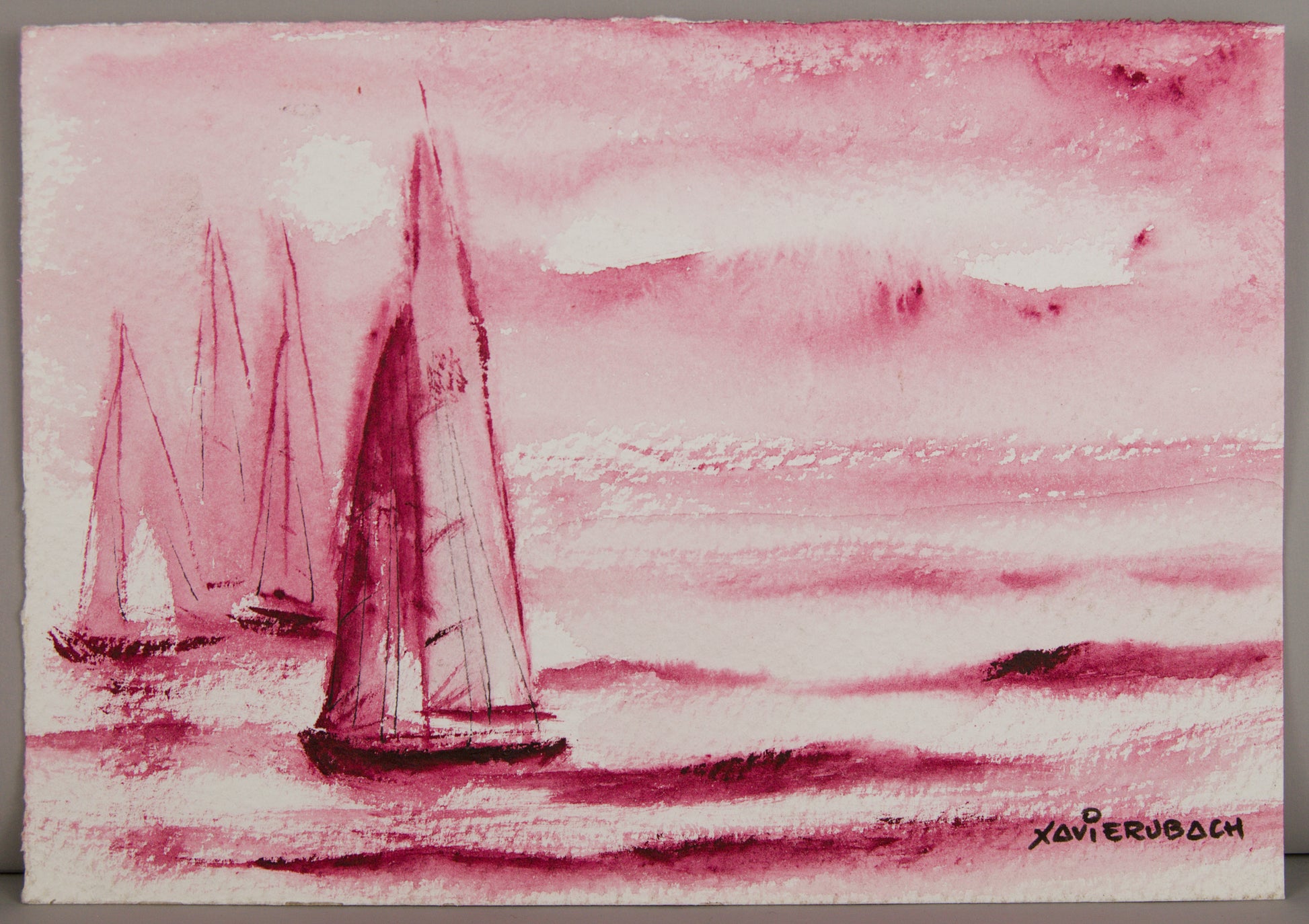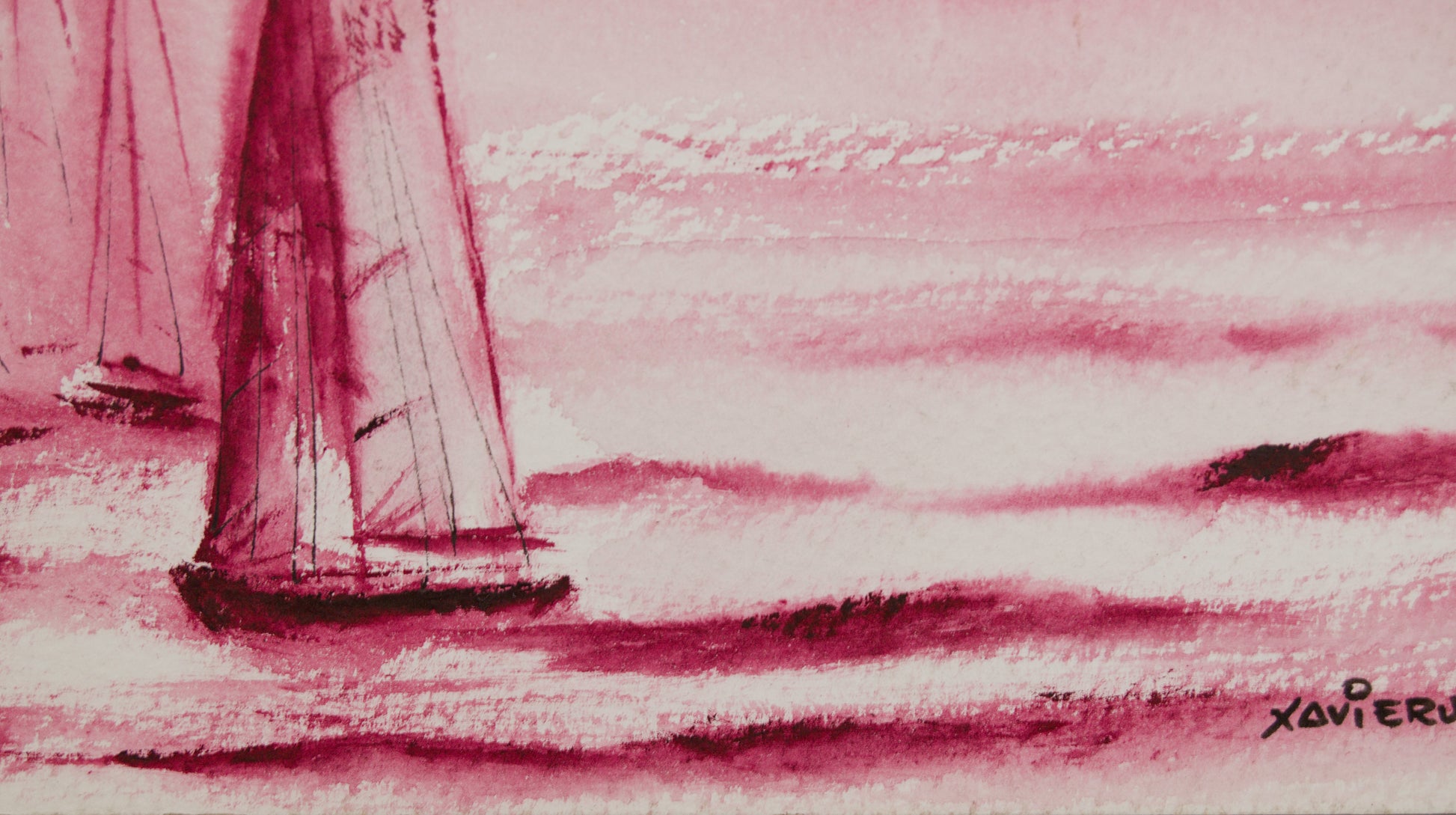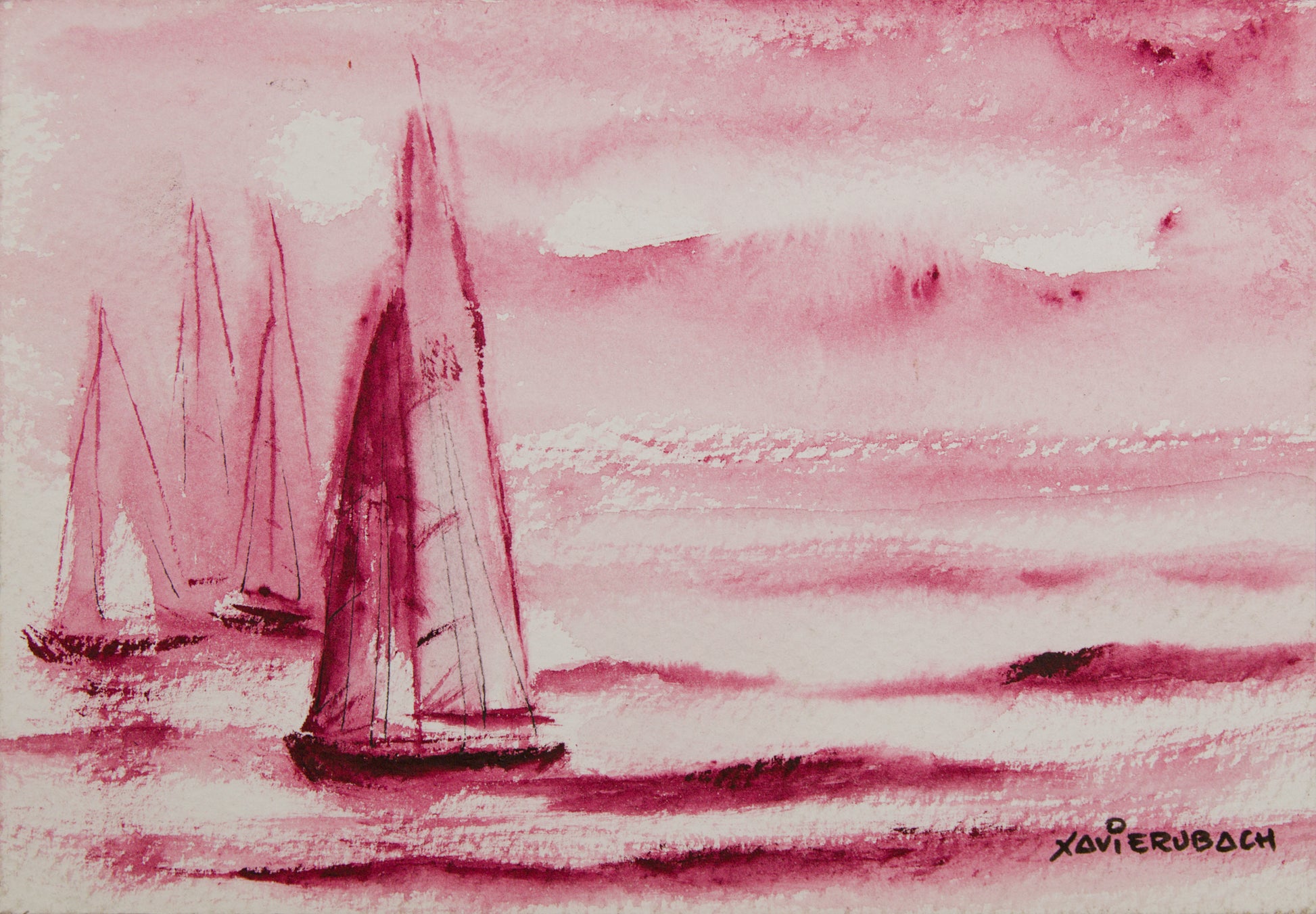 En esta pieza excepcional, Xavier Ubach nos invita a una travesía directa hacia la abstracción lírica. El paisaje marino se despoja aquí de todo lo accesorio, de cualquier anécdota narrativa, para revelar su esencia más pura. A través de la autolimitación a una paleta estrictamente monocromática —basada en un intenso y vibrante tono carmín o magenta—, el artista logra una atmósfera de ensoñación y serenidad rotunda.