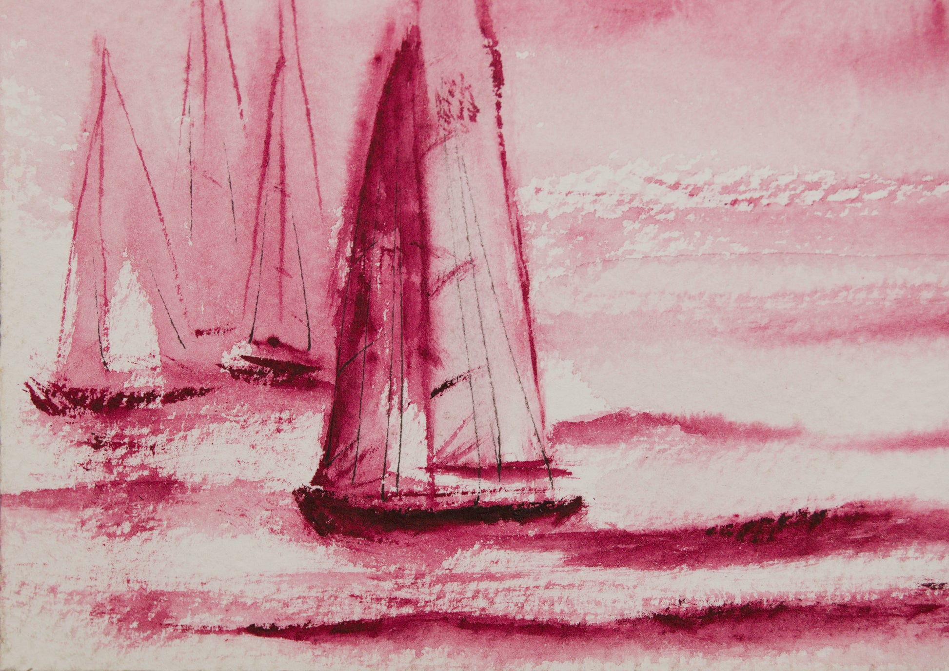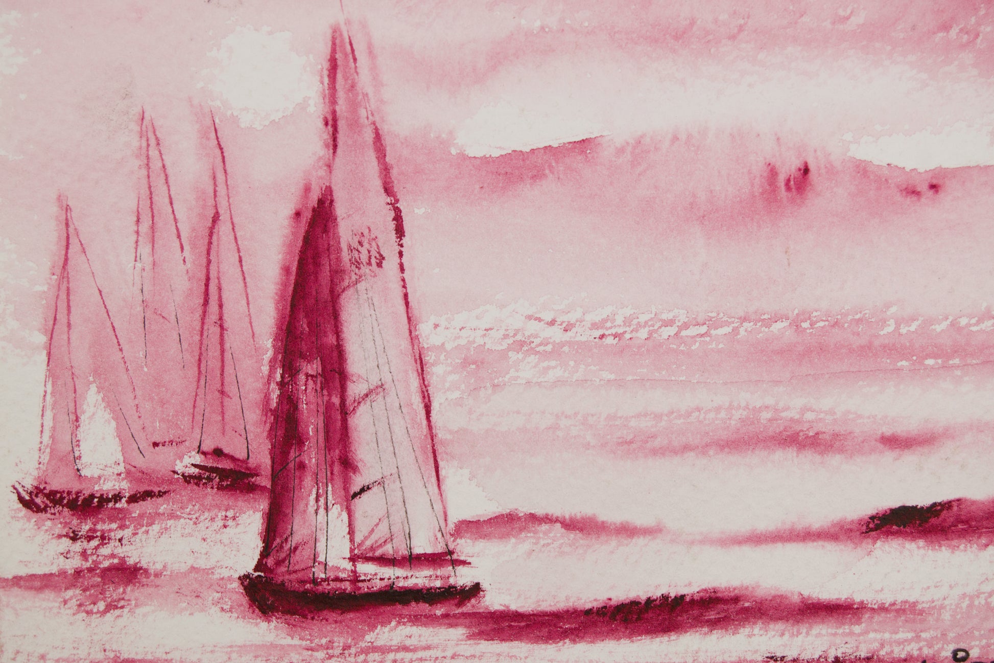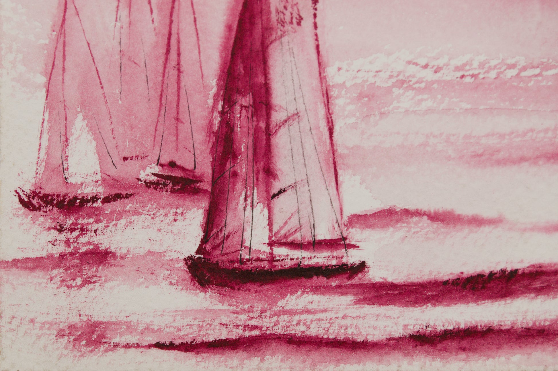 Título / Tema: Marina en carmín / Velas en la niebla (Abstracción Lírica / Paisaje marino).