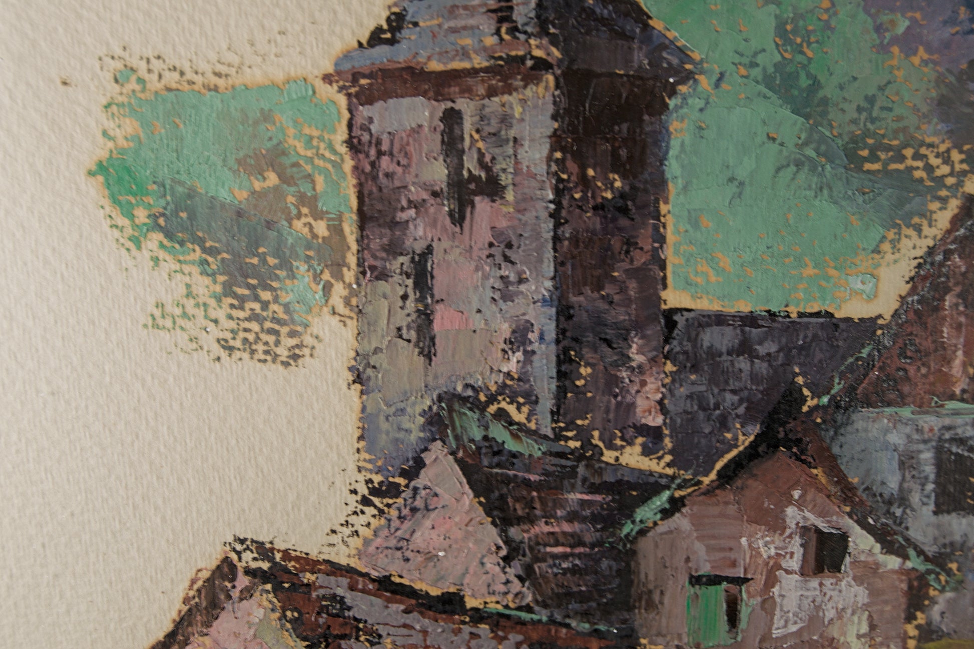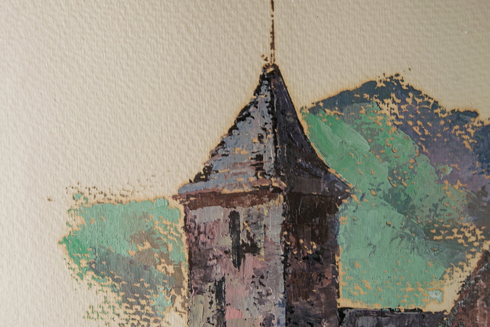 Esteban Escartín trasciende la representación clásica del paisaje rural para construir una interpretación física y emocional del espíritu del Pirineo. Con una técnica de ejecución directa que roza lo escultórico, el autor prescinde del dibujo plano tradicional para "levantar" la arquitectura del pueblo directamente sobre el soporte. La robusta torre del campanario actúa como eje vertical de una composición que respira el equilibrio, el silencio y la fuerza indómita inherentes a los núcleos de alta montaña.