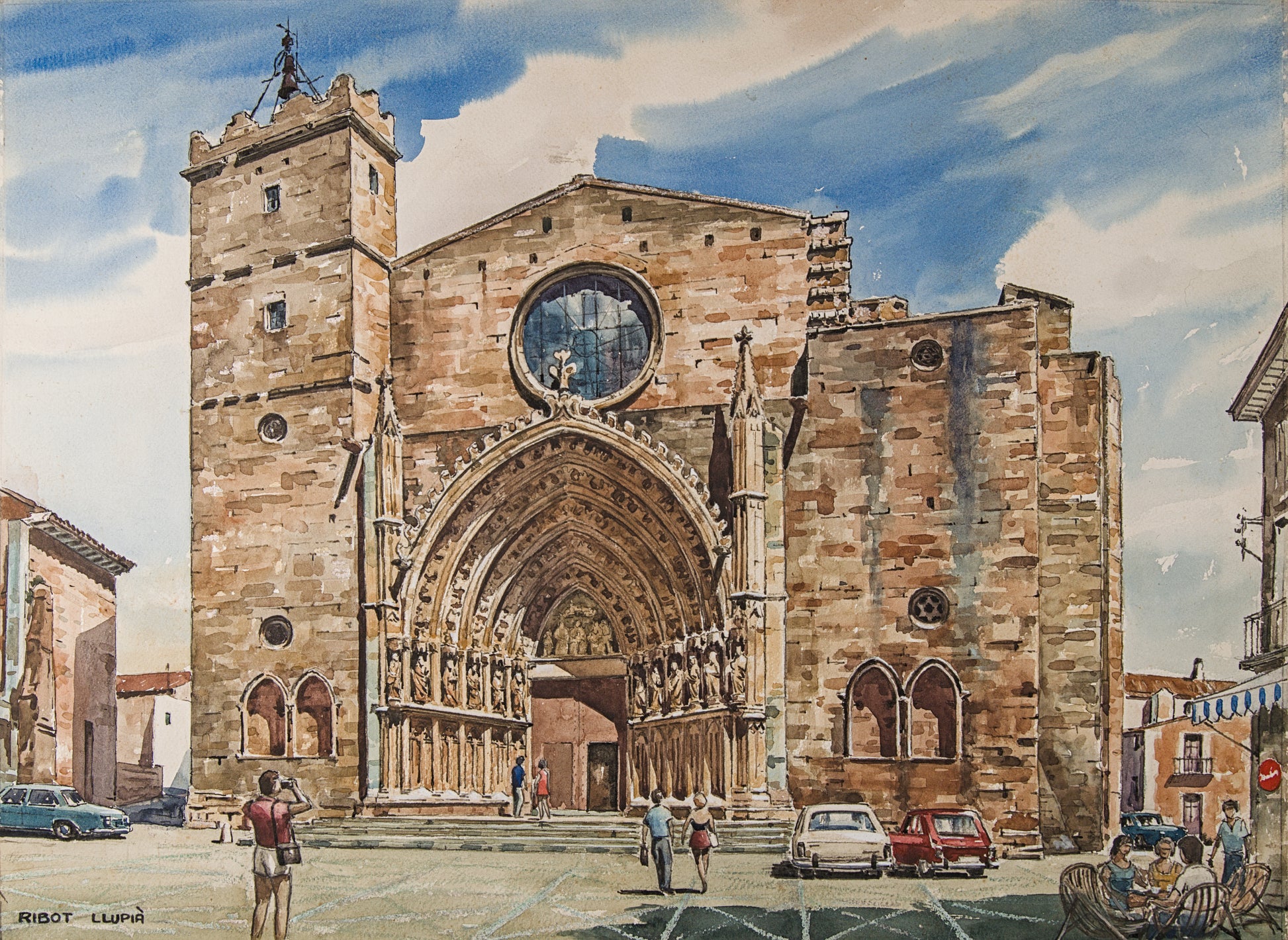 A nivel técnico, el artista despliega un dominio absoluto de la técnica de la acuarela, un medio implacable que no admite rectificaciones. El uso de un soporte de papel de alto gramaje permite a Ribot Llupiá jugar con la superposición de lavados limpios, logrando una luminosidad y una profundidad atmosférica excepcionales en el cielo y en la piedra de la catedral. La pincelada es ágil y descriptiva, trazando las sombras proyectadas con una precisión geométrica que demuestra un conocimiento profundo de la perspectiva.