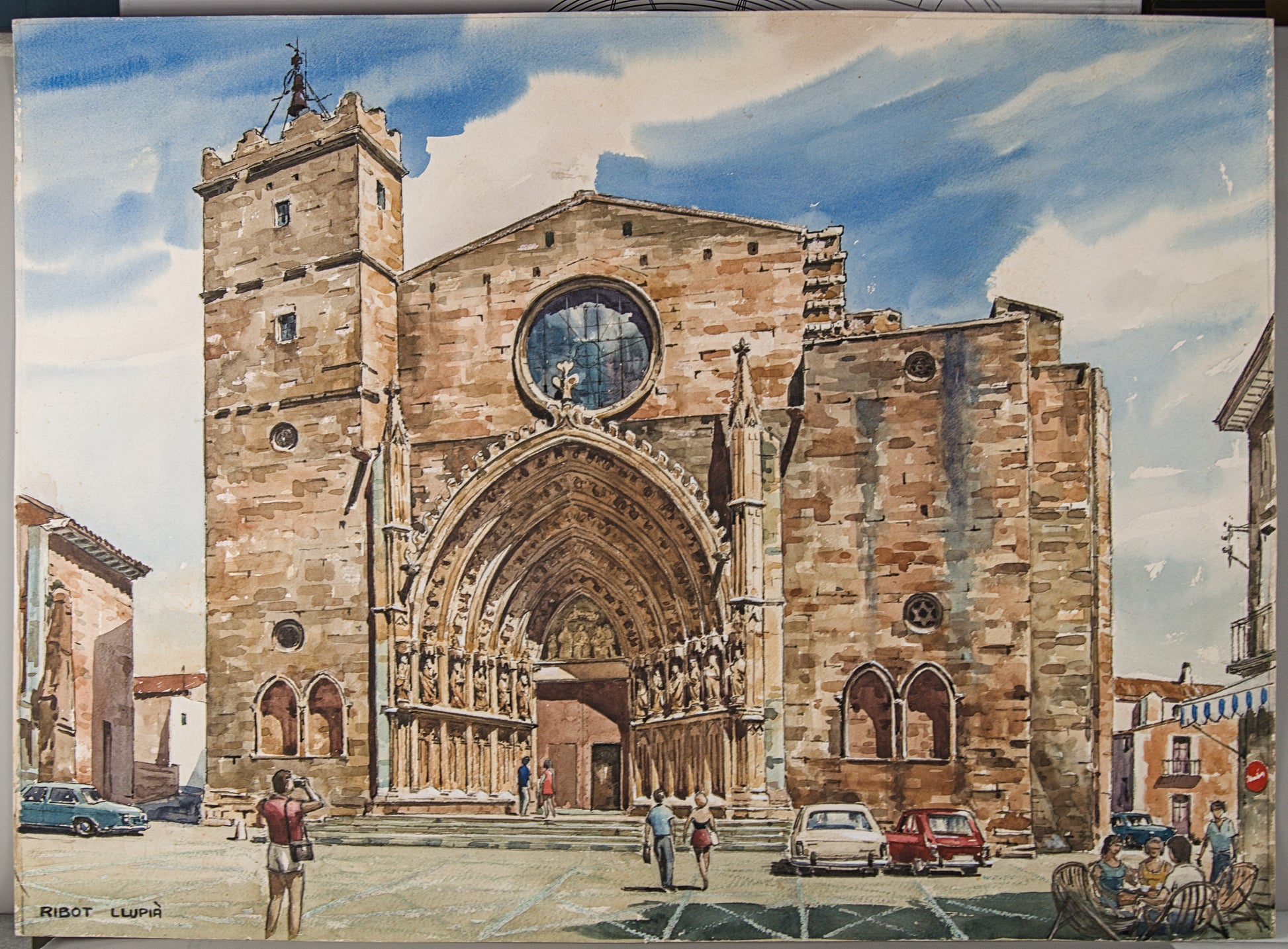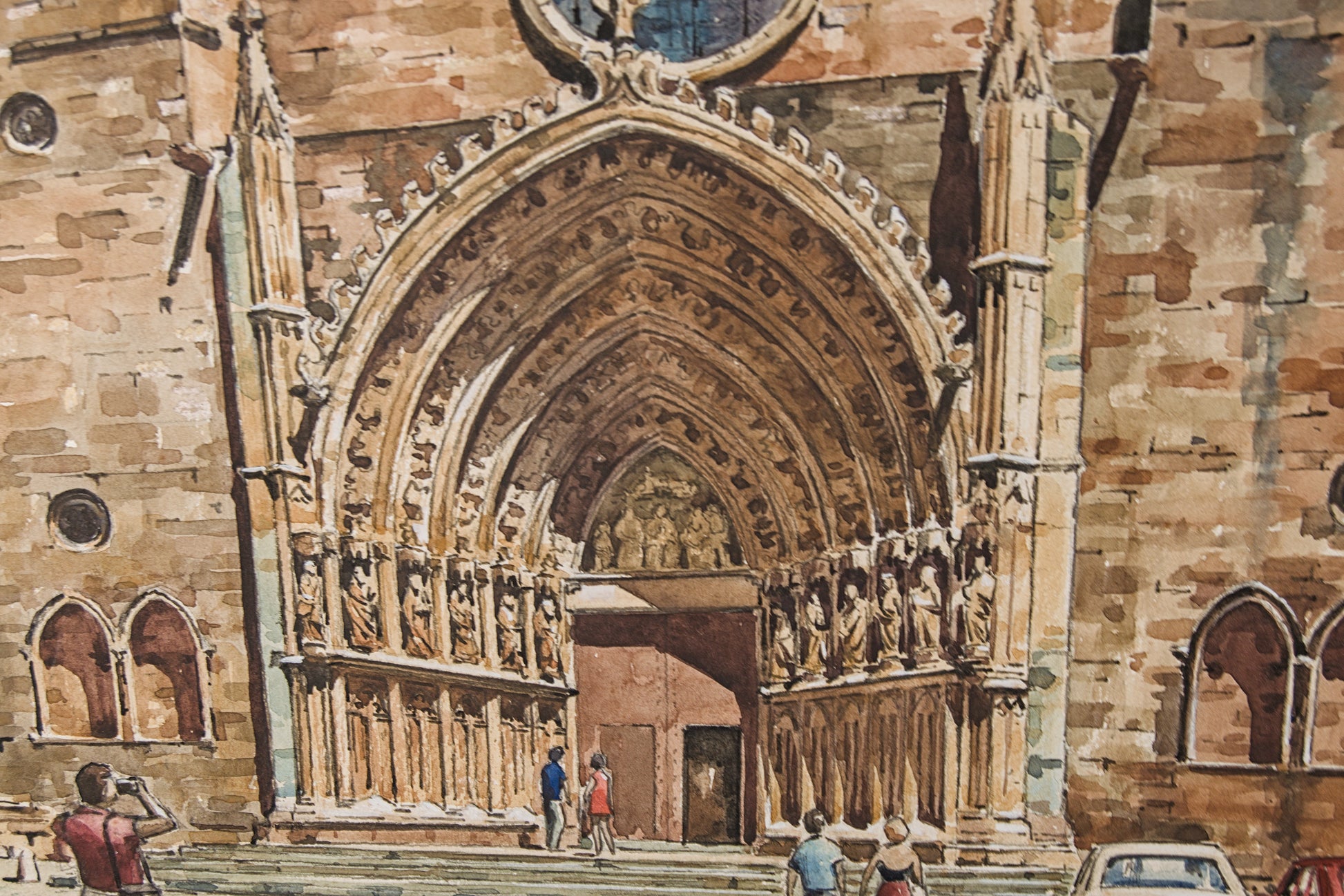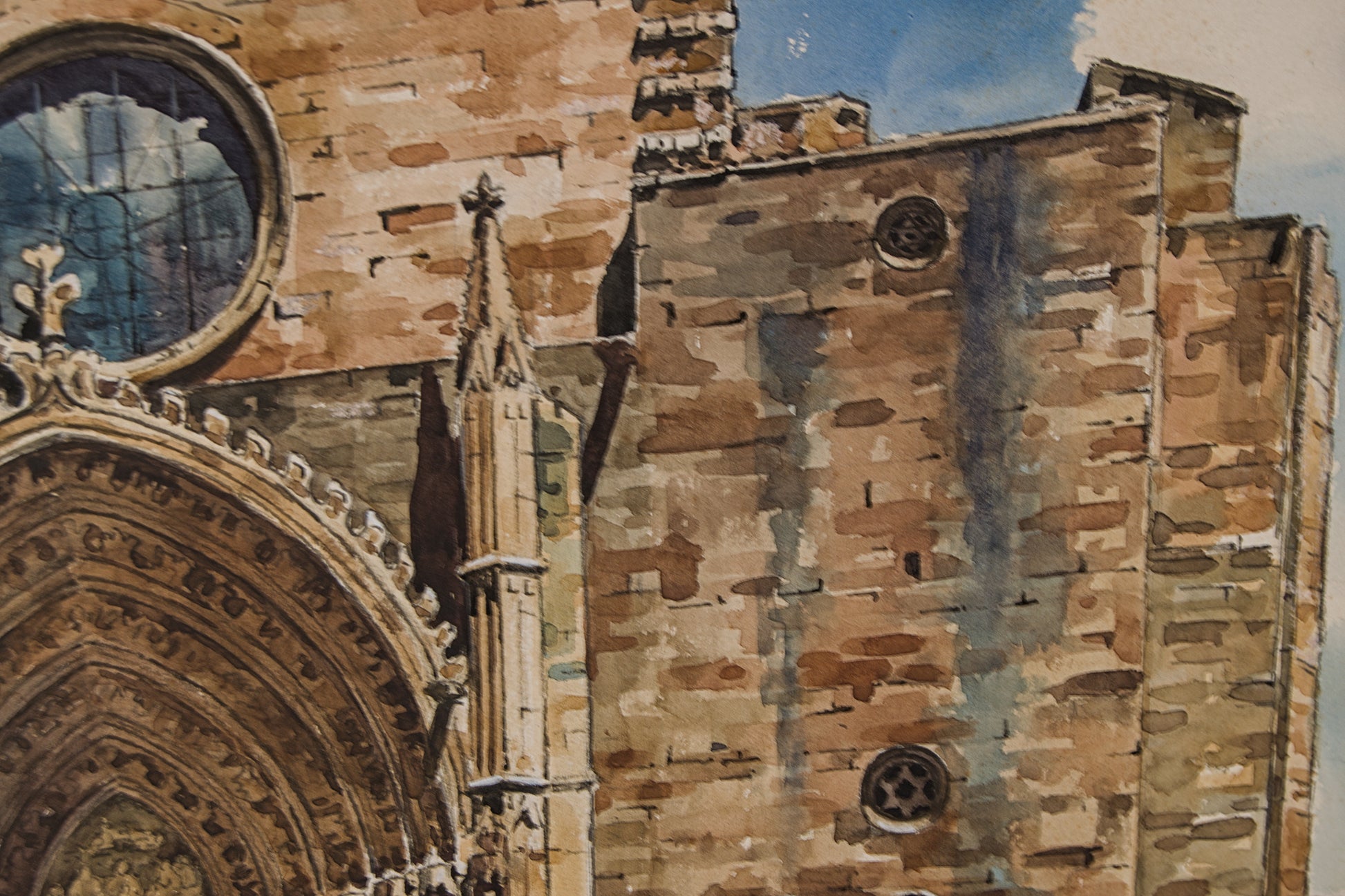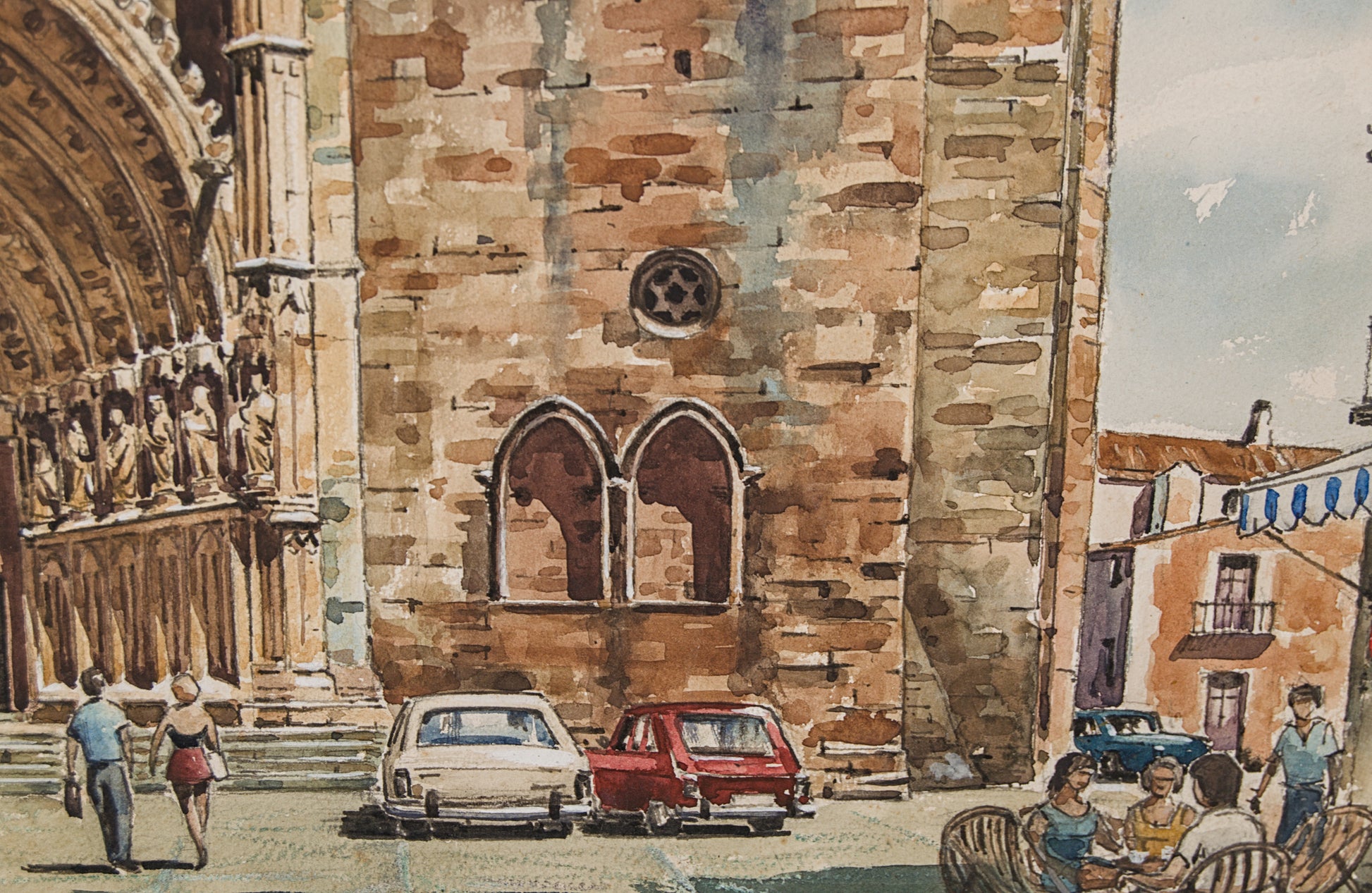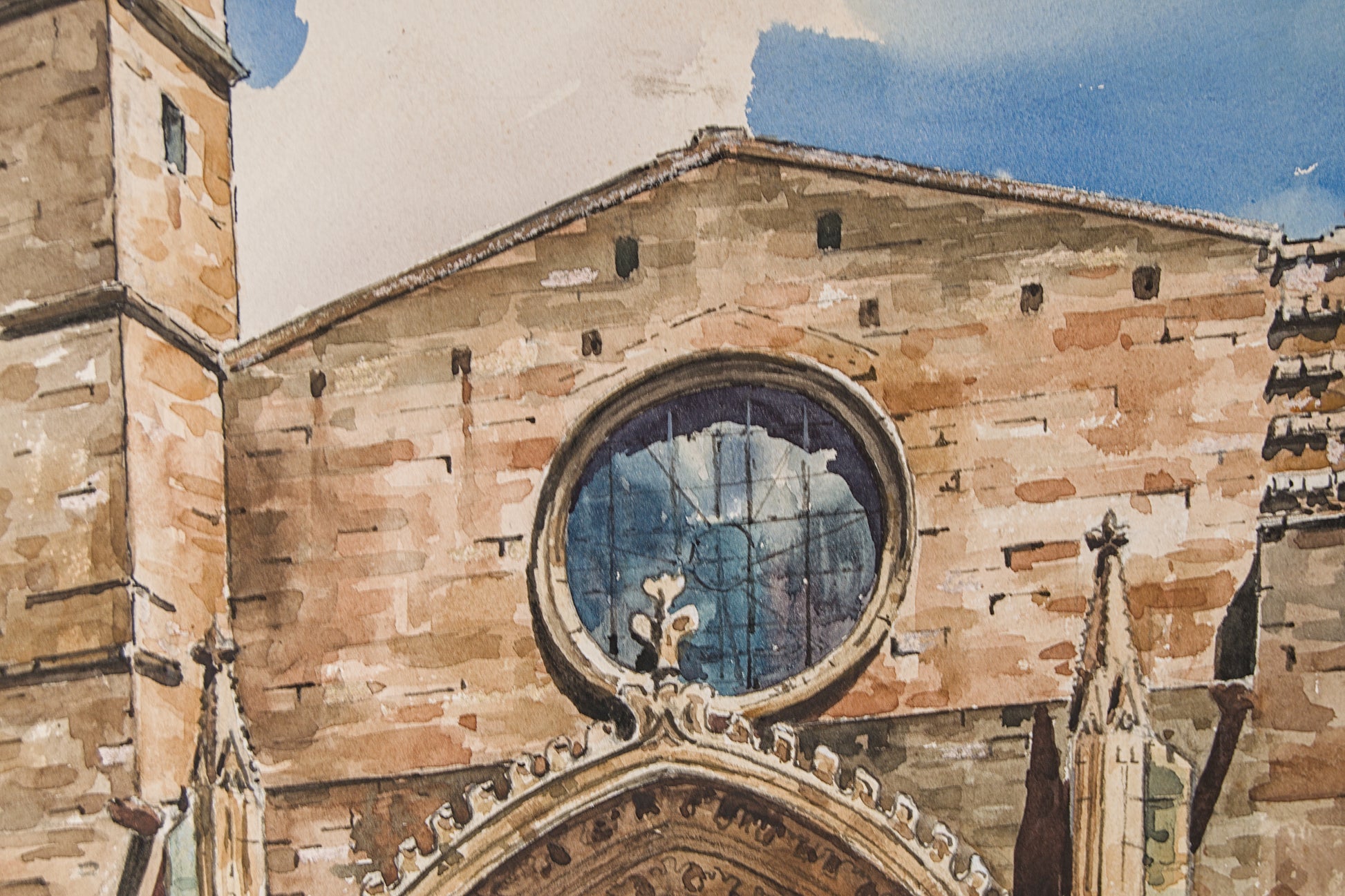 La buena acuarela arquitectónica no consiste en pintar cada ladrillo, sino en hacer que la luz defina el volumen de la piedra. En esta pieza, Ribot Llupiá logra exactamente eso, contraponiendo la eternidad de la catedral gótica con la fugacidad de una soleada mañana de los años setenta. Una adquisición de gran prestigio, ideal para el coleccionista que valora el rigor del dibujo clásico y la historia viva de nuestras ciudades.