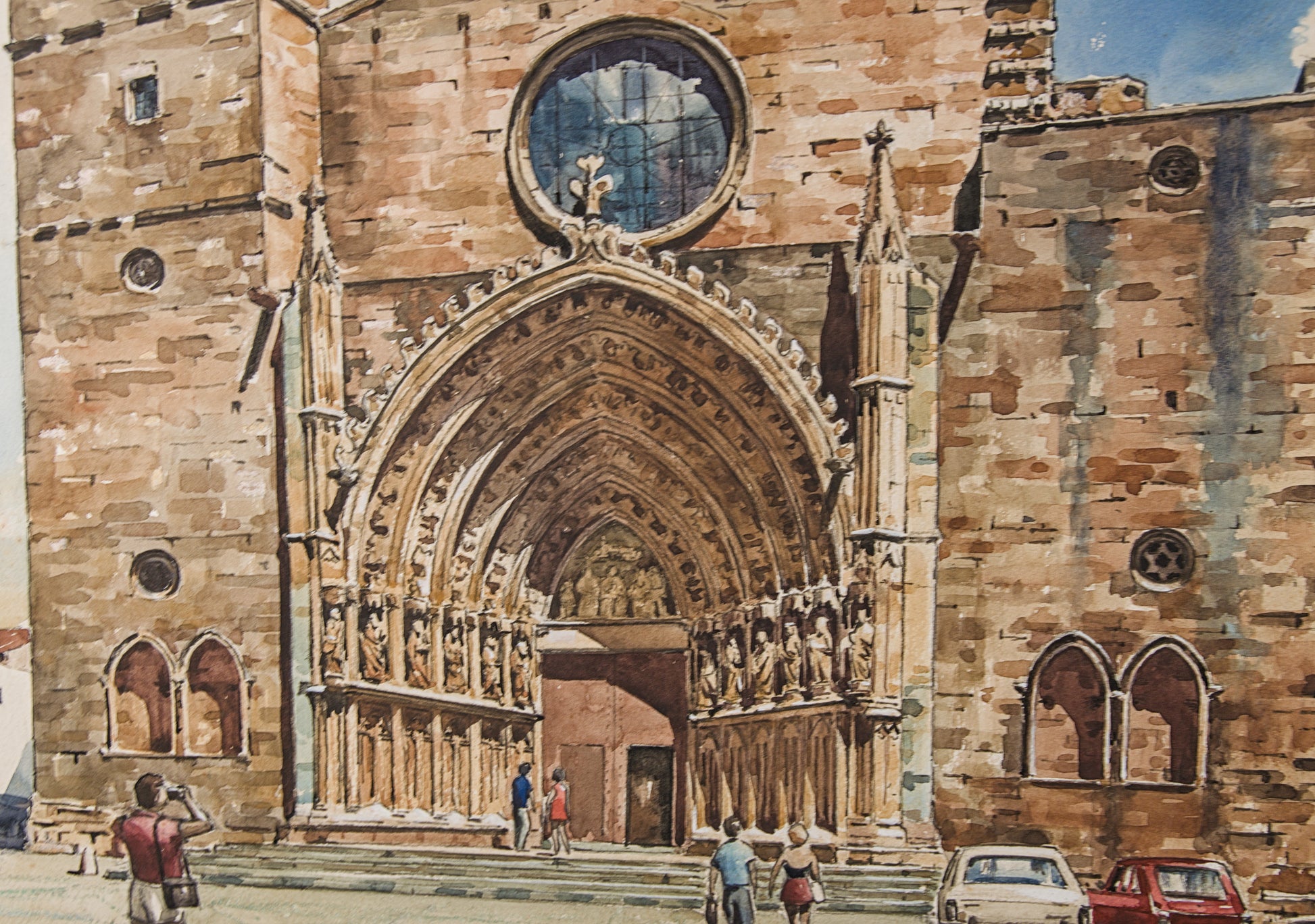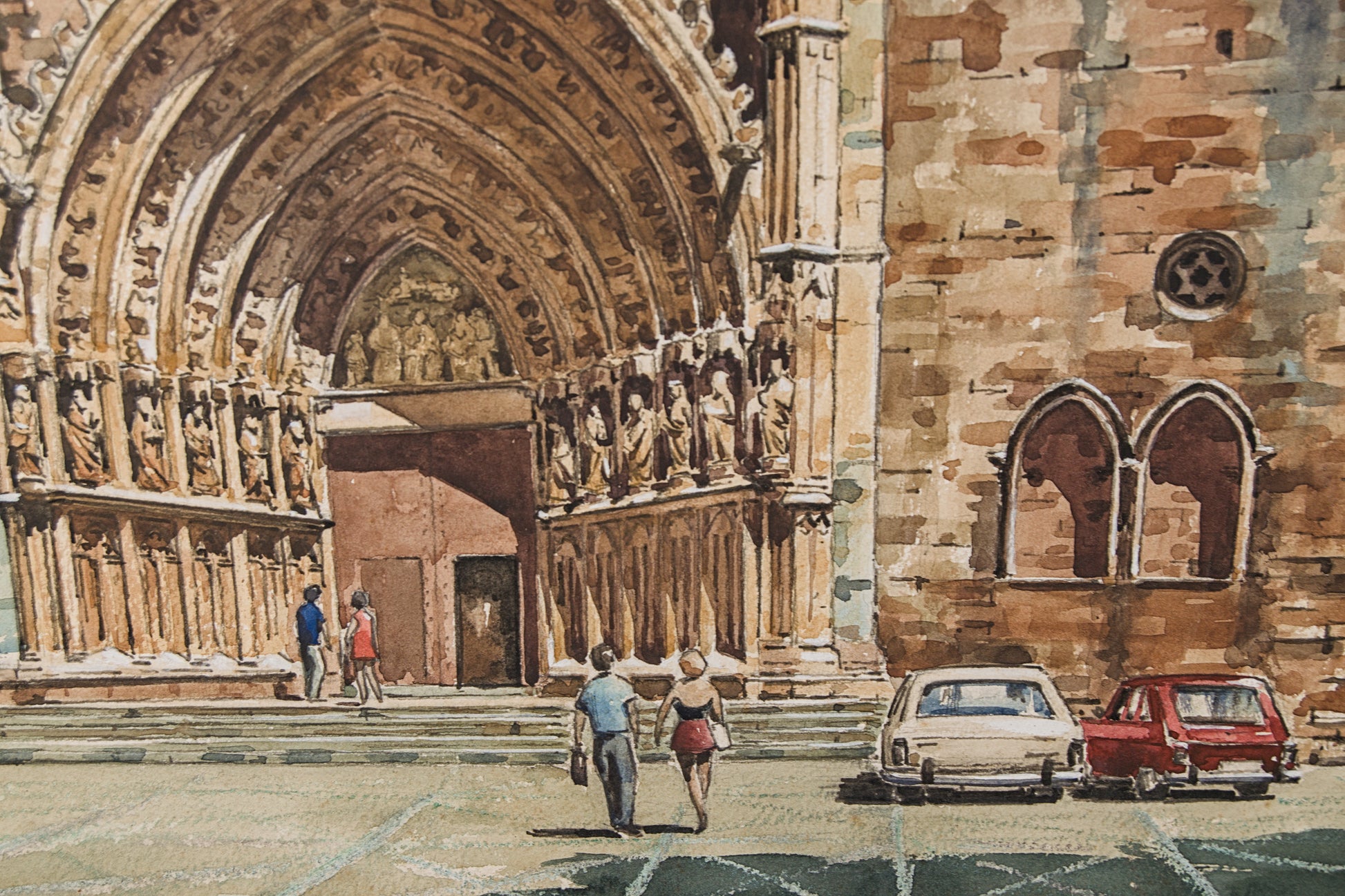 Virtuosismo Arquitectónico: Capturar la monumentalidad y la escala de un edificio gótico exclusivamente a base de agua y pigmento exige un nivel de maestría técnica al alcance de muy pocos acuarelistas.