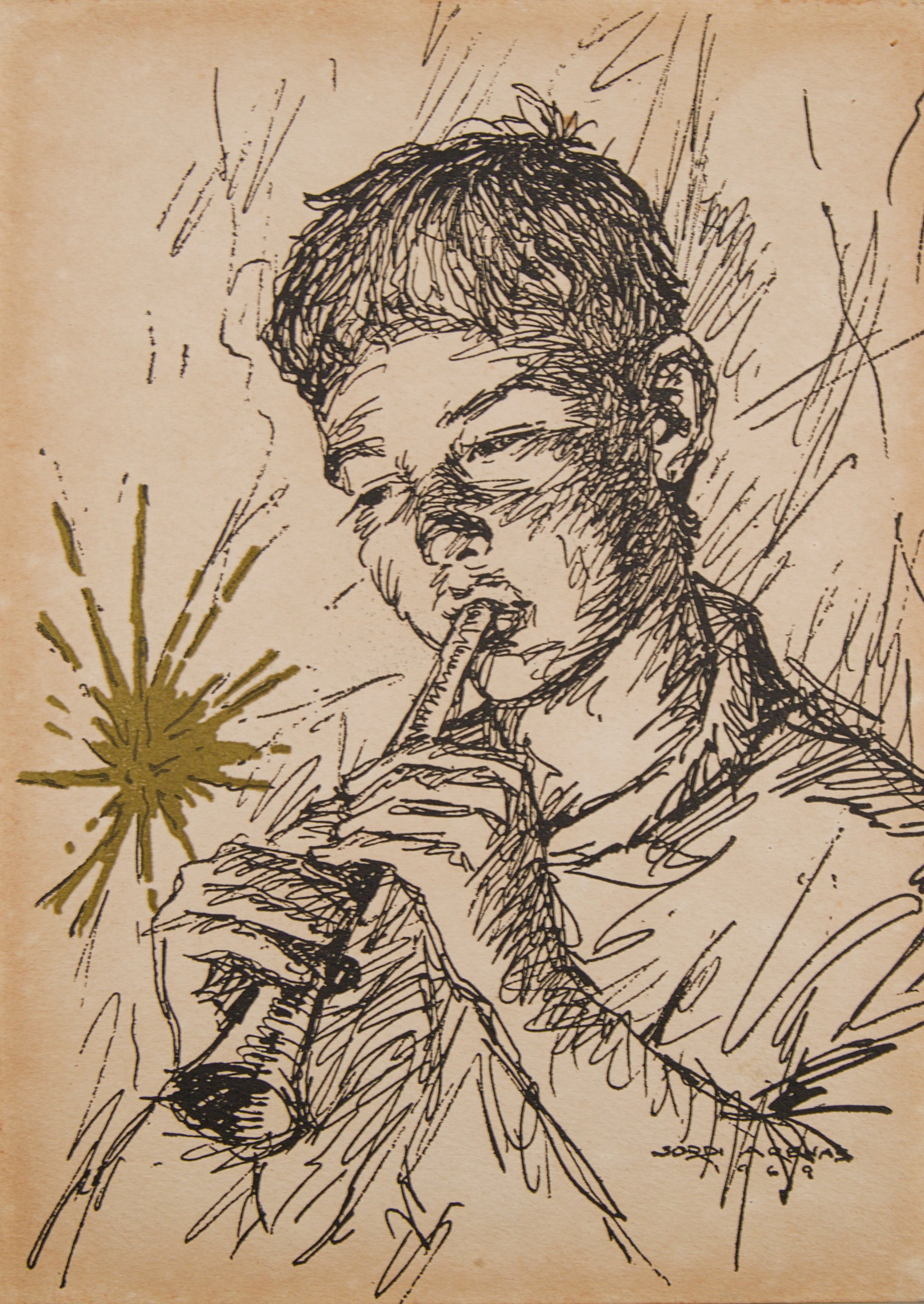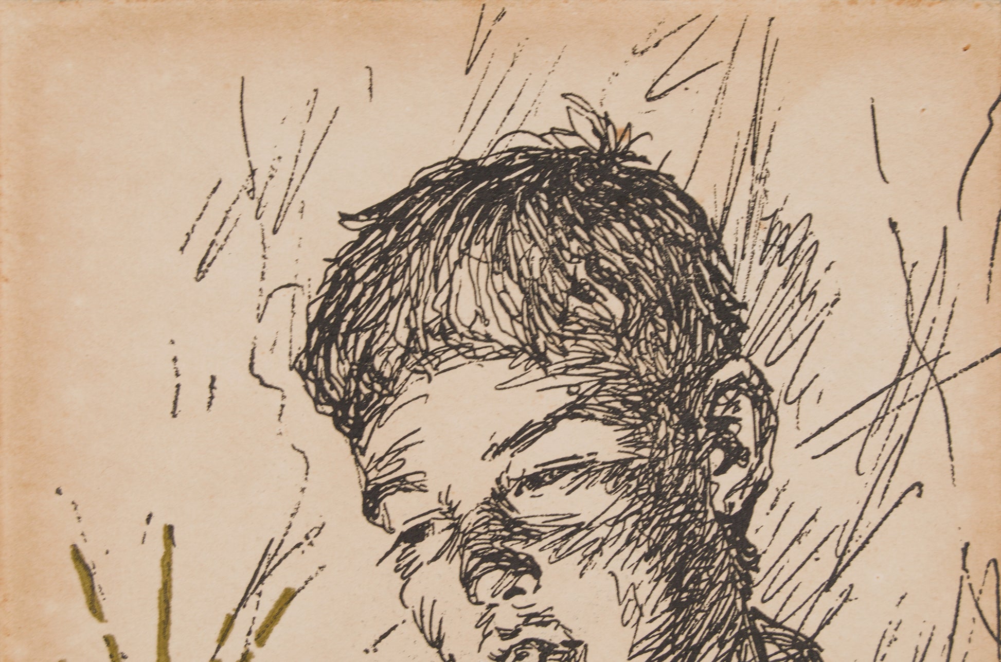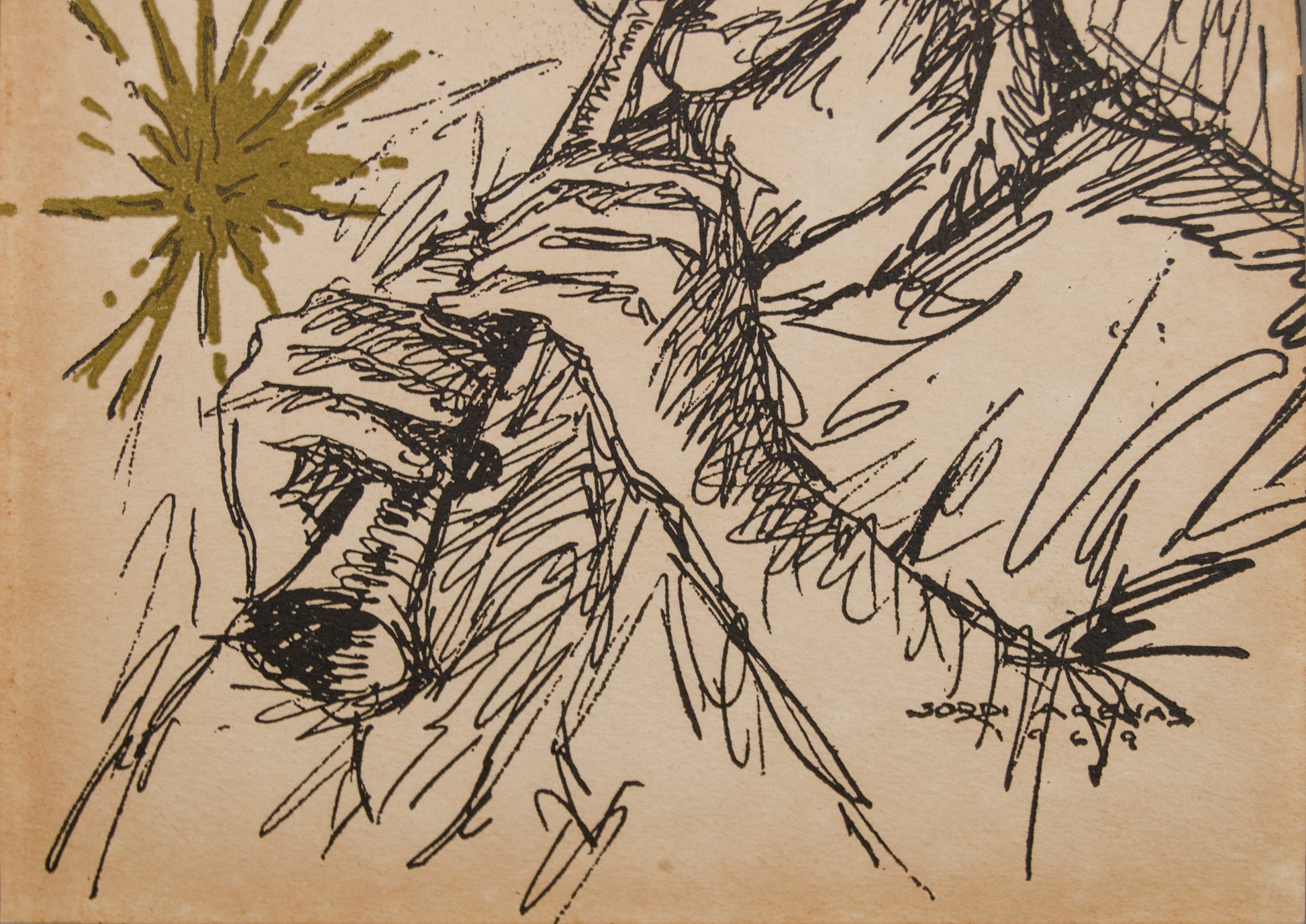 En el corazón de la producción artística de Jordi Arenas i Clavell (1920-1998) existe una búsqueda constante por atrapar la emoción pura y el movimiento. Este dibujo, plenamente fechado en 1969, es una pieza excepcional de su madurez creativa. Representando a un joven ensimismado en la ejecución de un instrumento de viento tradicional (posiblemente una gralla o flauta), Arenas utiliza un trazo de tinta negro abrumadoramente dinámico, casi frenético, a base de líneas entrecruzadas que parecen vibrar físicamente en el papel.