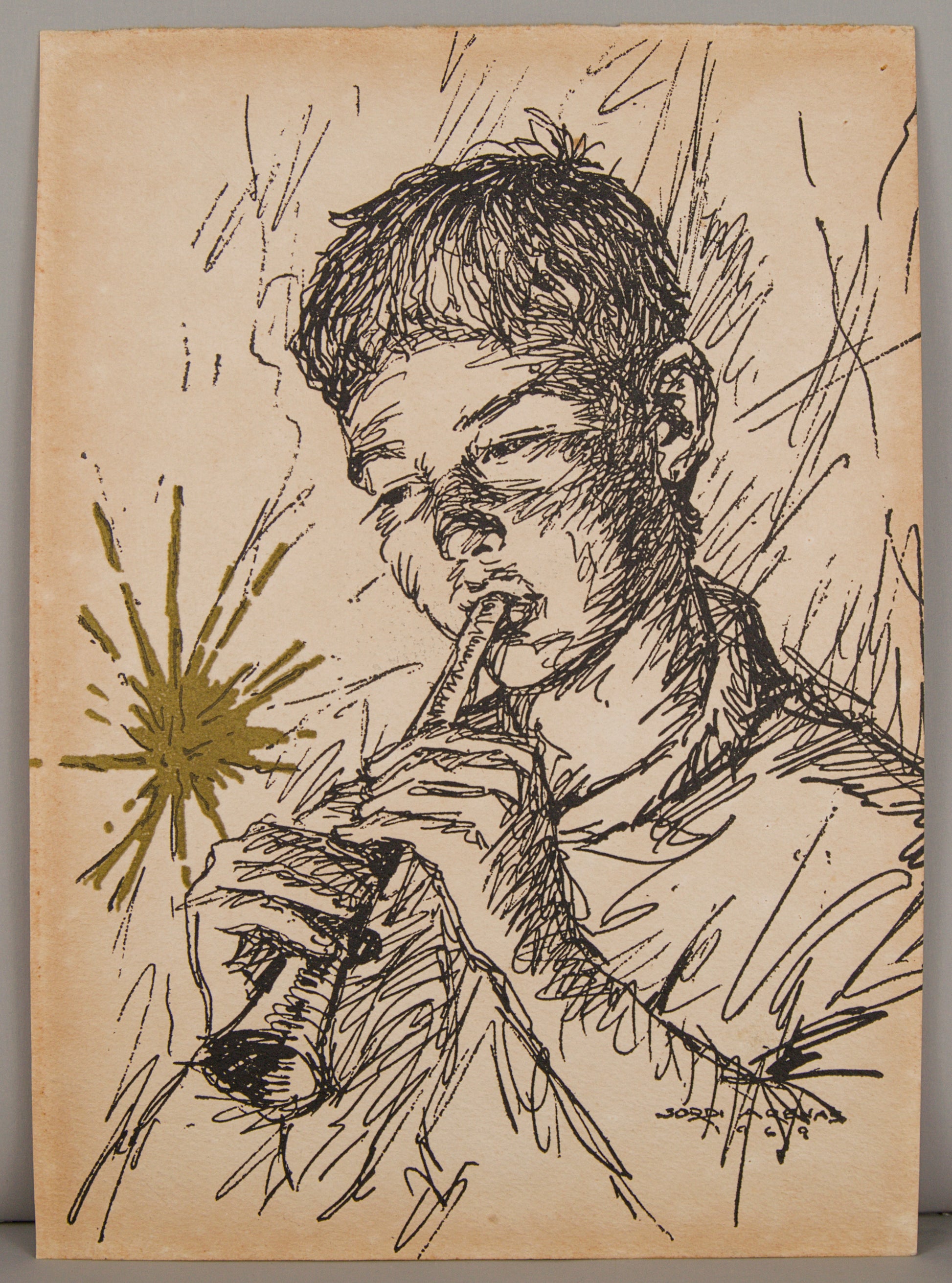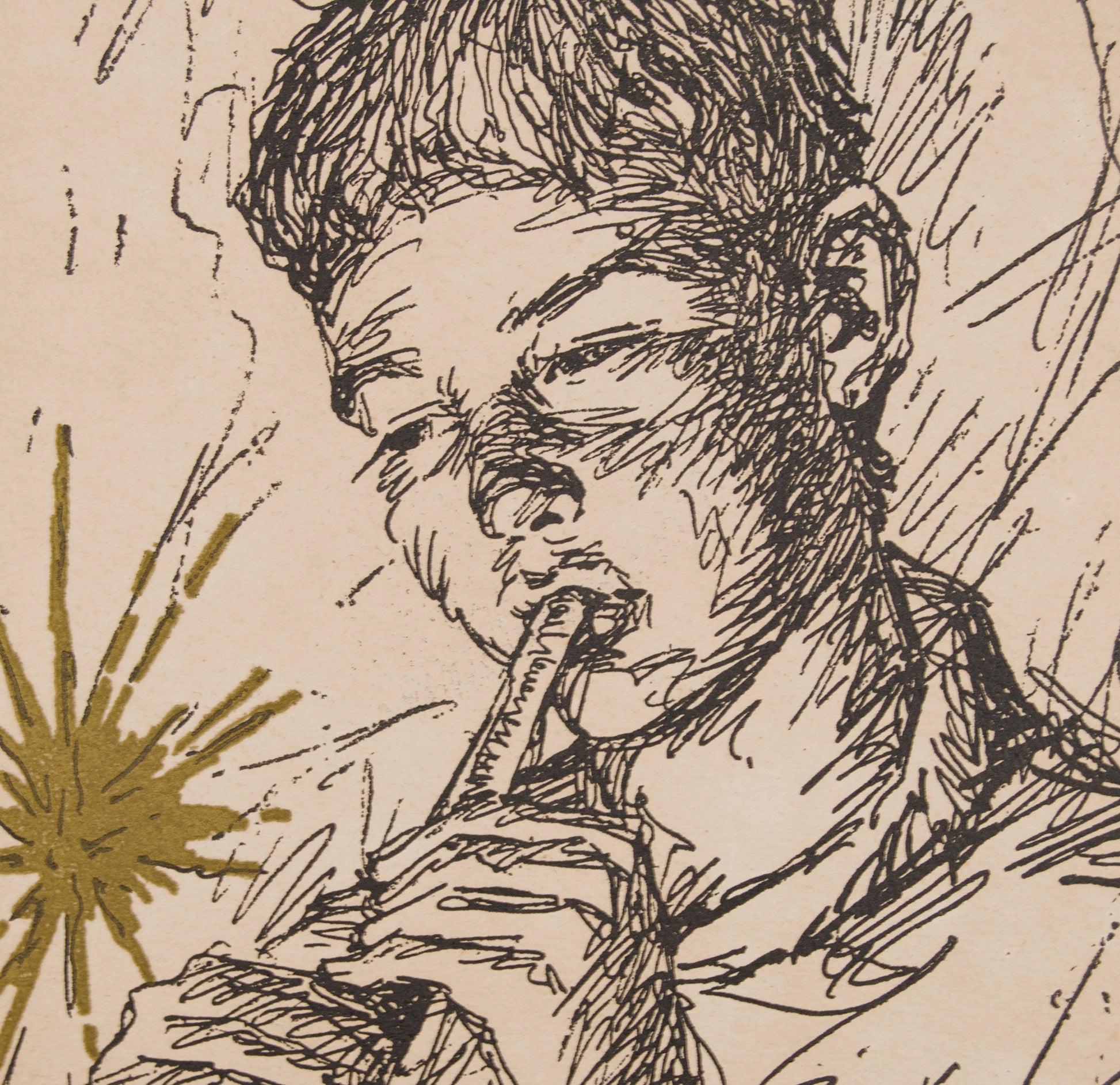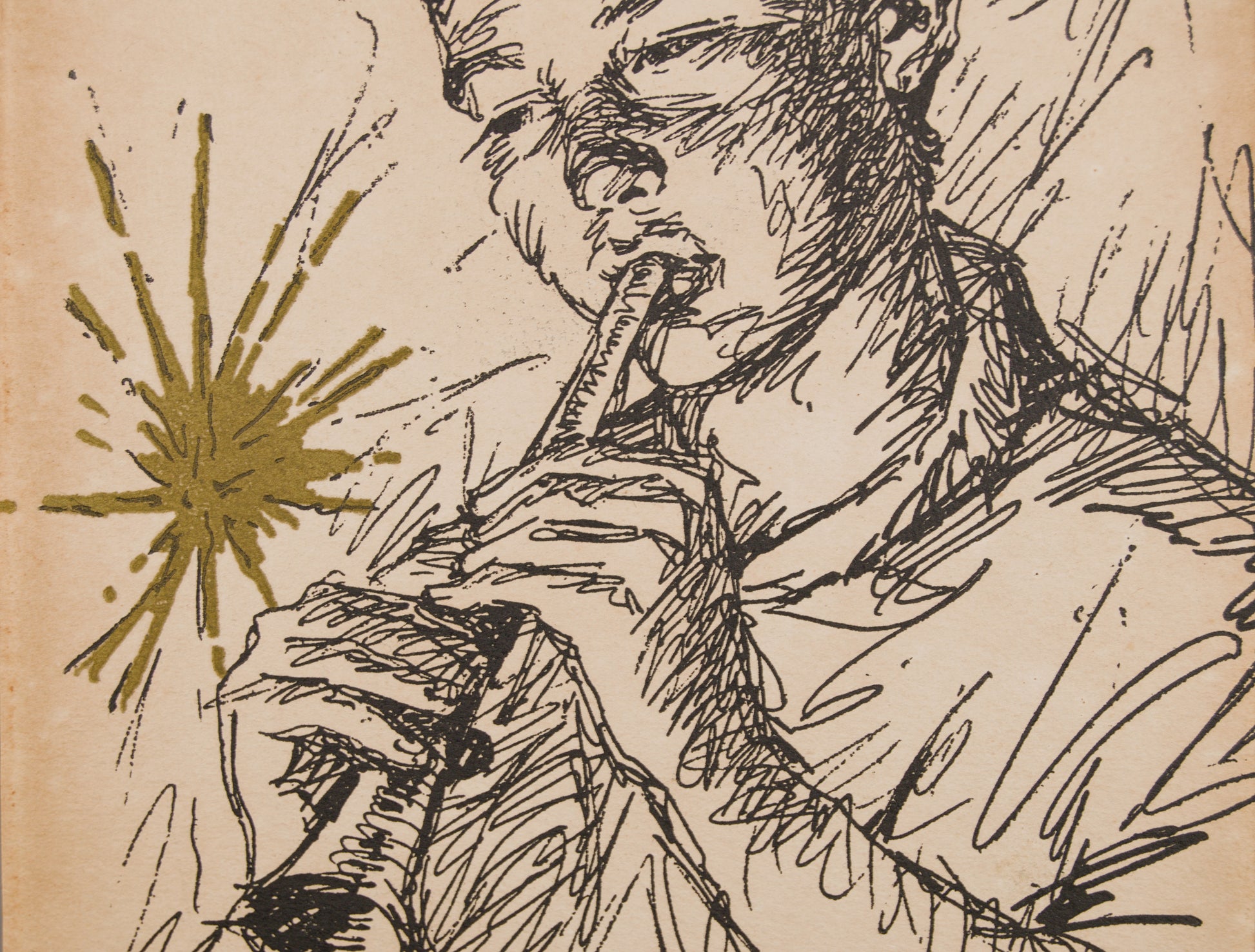 En el corazón de la producción artística de Jordi Arenas i Clavell (1920-1998) existe una búsqueda constante por atrapar la emoción pura y el movimiento. Este dibujo, plenamente fechado en 1969, es una pieza excepcional de su madurez creativa. Representando a un joven ensimismado en la ejecución de un instrumento de viento tradicional (posiblemente una gralla o flauta), Arenas utiliza un trazo de tinta negro abrumadoramente dinámico, casi frenético, a base de líneas entrecruzadas que parecen vibrar físicamente en el papel.