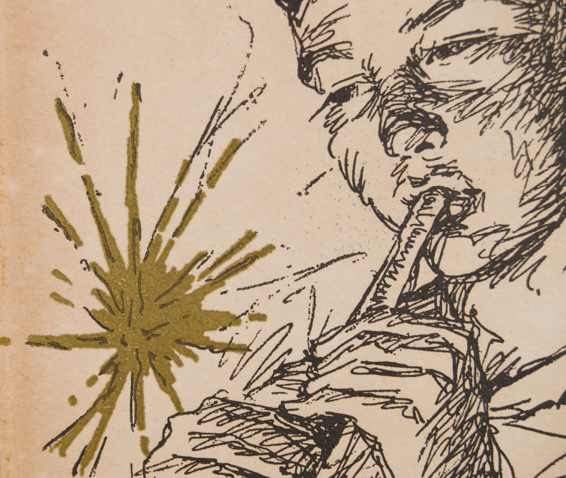 El hallazgo estético y el elemento diferenciador de esta estampa es la rotunda aplicación de pigmento brillante (probablemente gouache o tinta metálica bronce/dorada) en el margen izquierdo. Esta forma estrellada no es un recurso decorativo; es pura "sinestesia". Es la representación plástica del sonido, una nota musical que emana del instrumento y rasga el espacio. La técnica de Arenas aquí es audaz: permite que la tinta negra narre la anatomía, mientras que el destello metálico narra la magia acústica del instante.