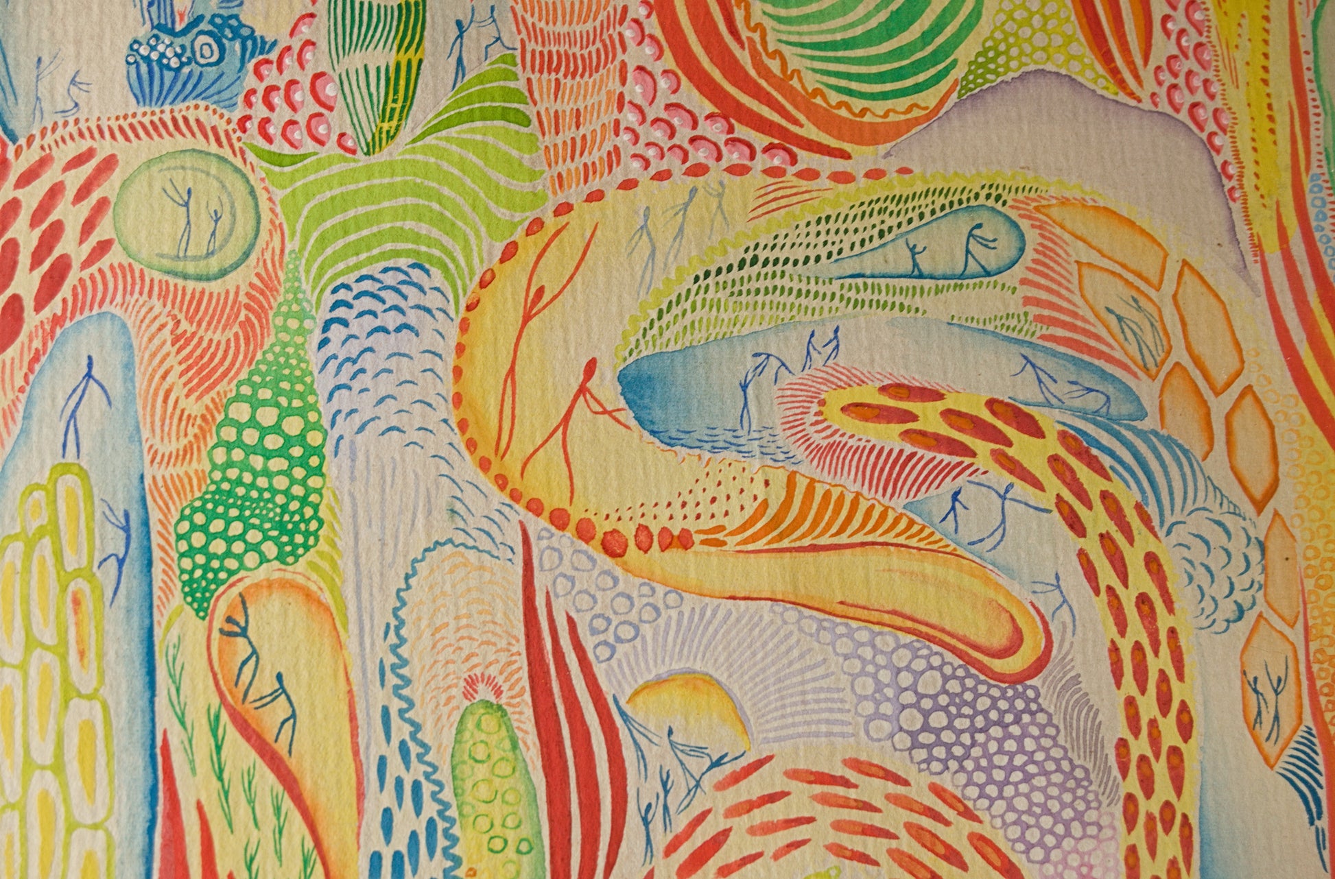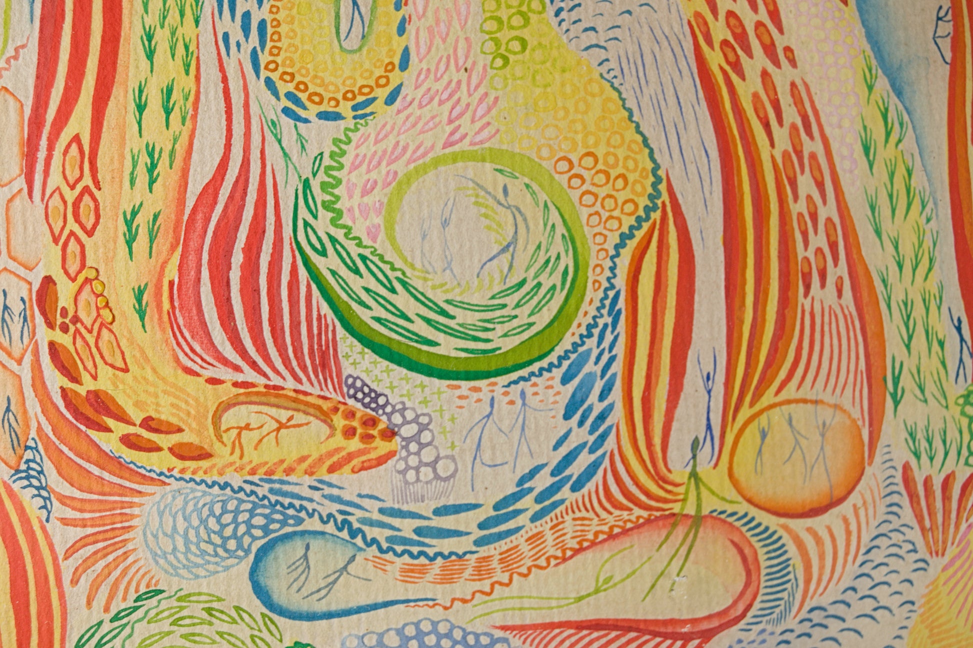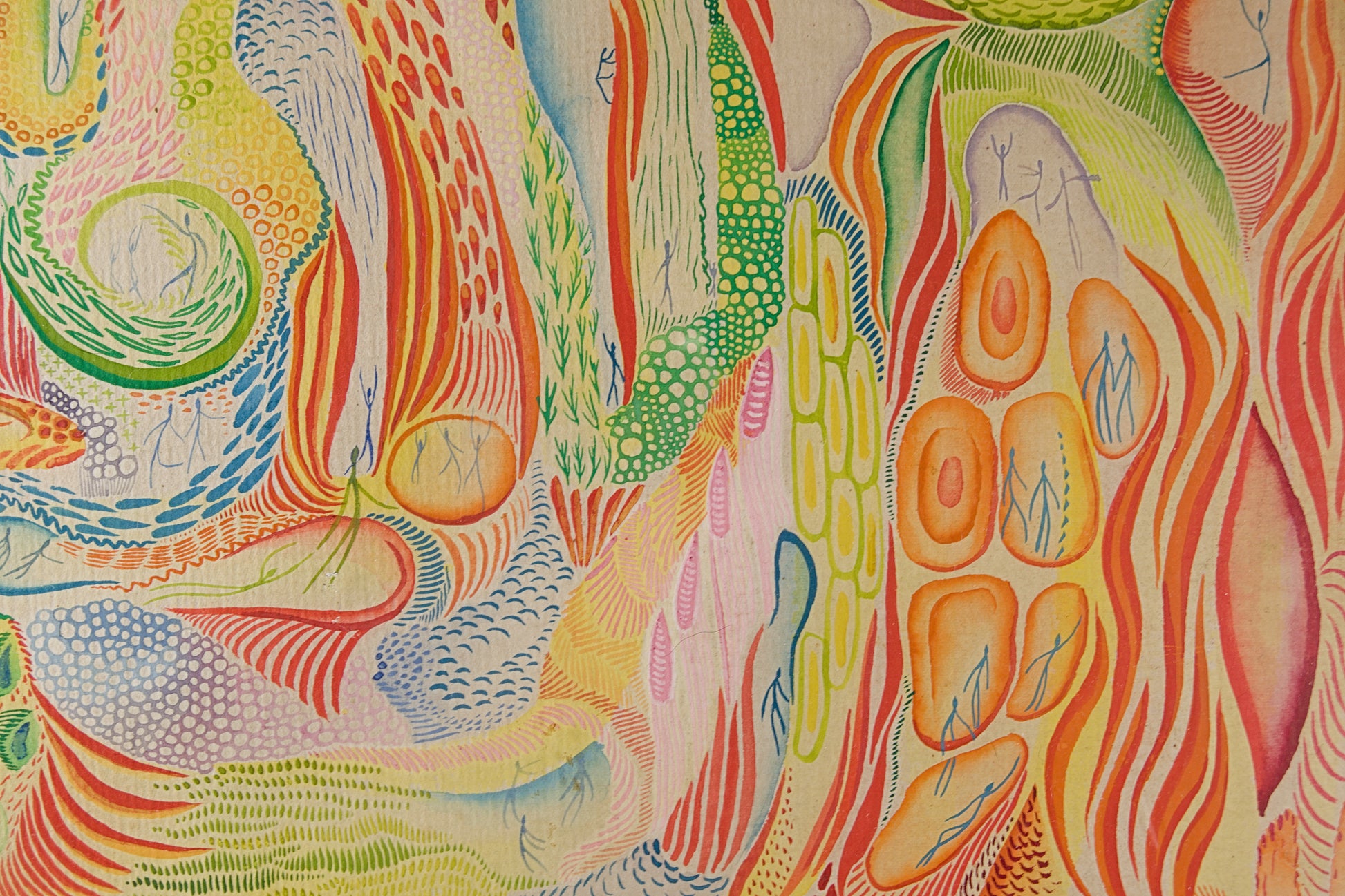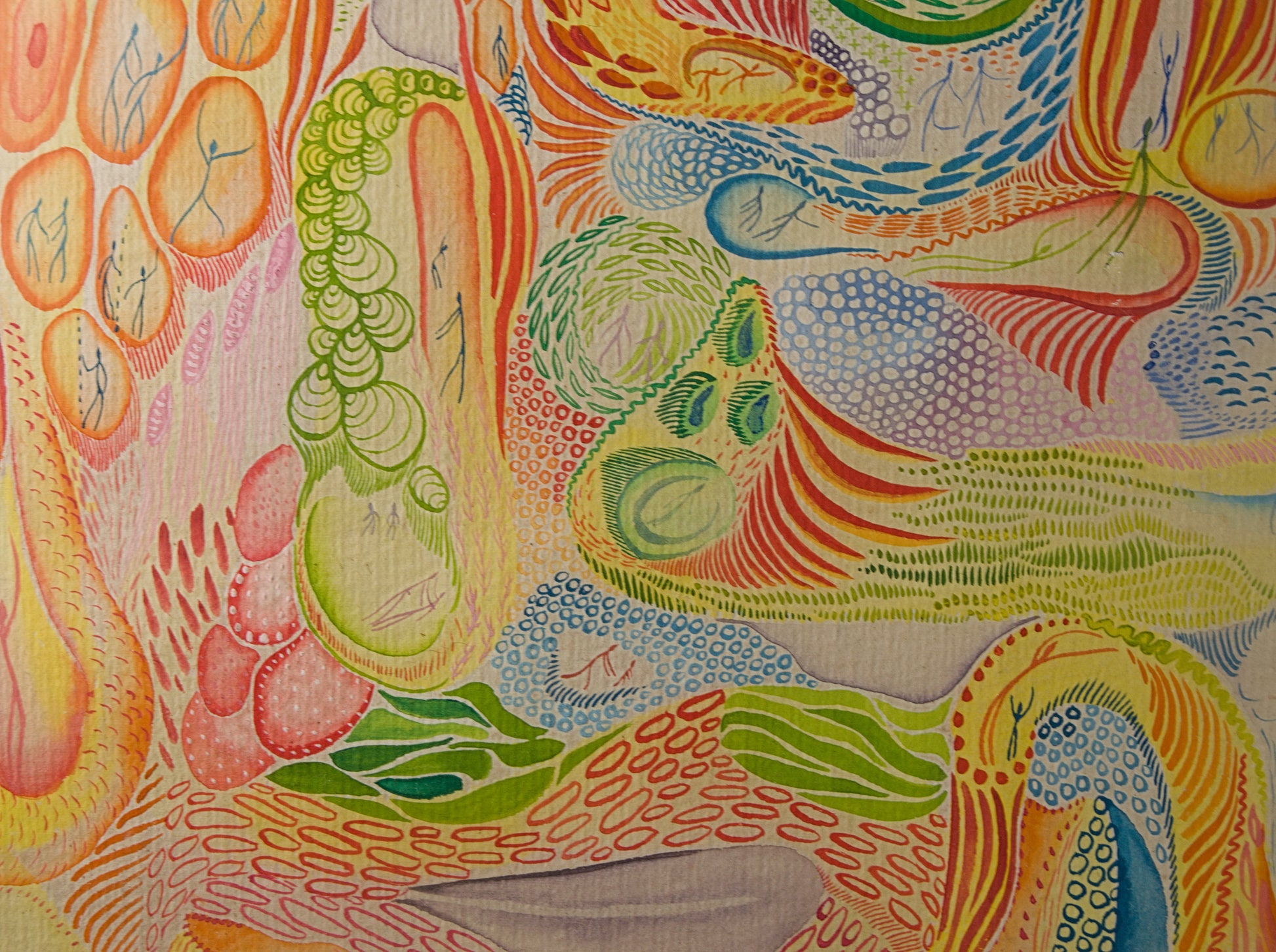A nivel formal, la composición es de una densidad técnica abrumadora. Linares despliega un ecosistema de flujos energéticos, estructuras biomórficas y retículas orgánicas trazadas con un pulso nervioso pero de precisión milimétrica. El hallazgo visual más extraordinario de la obra es la integración de su característica micro-figuración: decenas de diminutas siluetas humanas trazadas con sutiles líneas azules y verdes que transitan, bailan o germinan en el interior de estas cápsulas celulares. La paleta cromática, vibrante y saturada en tonos cálidos —naranjas, amarillos, verdes hoja y azules cian—, genera una sensación de movimiento perpetuo y respiración, dotando a la pieza de una cadencia visual hipnótica.