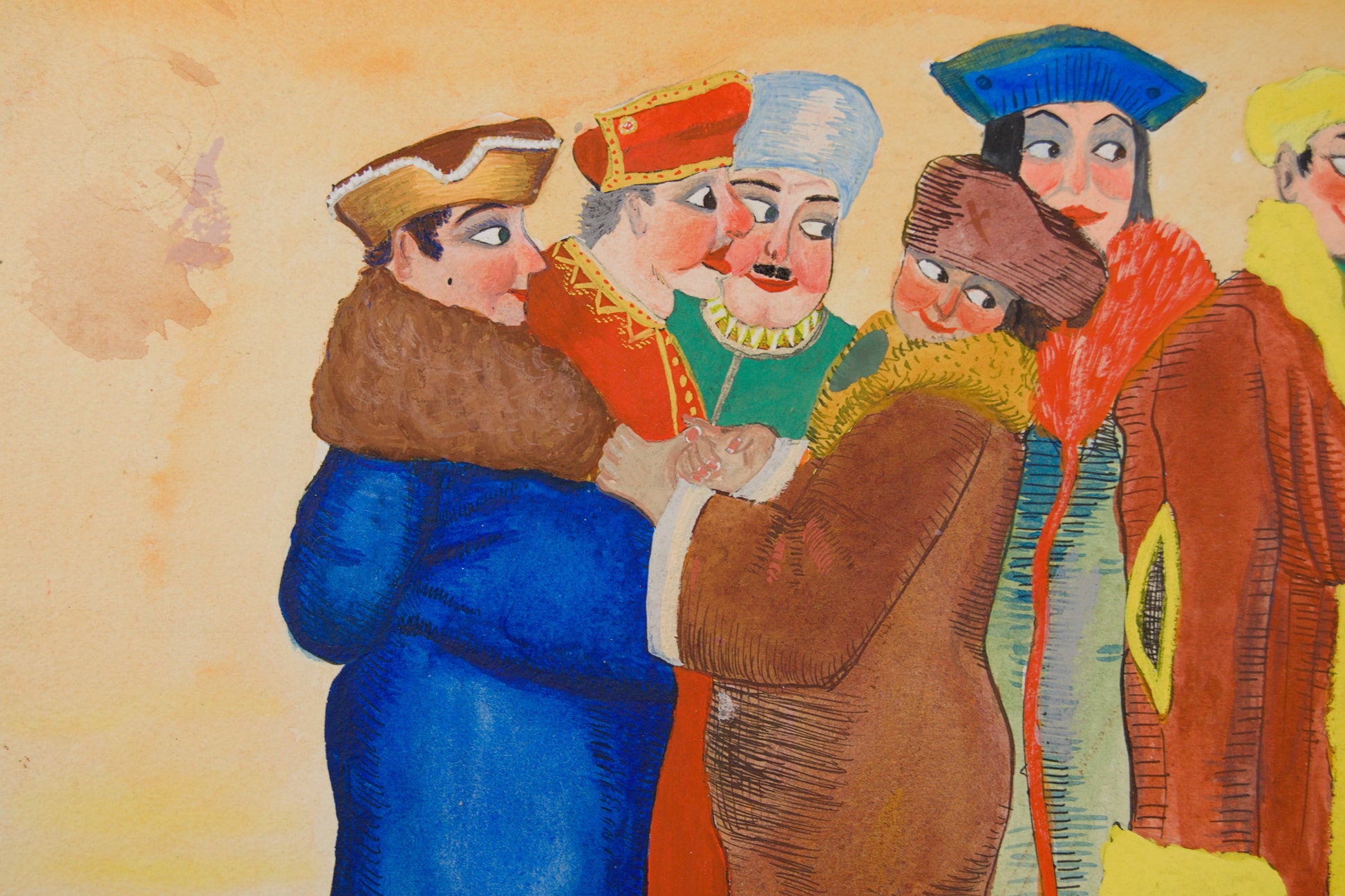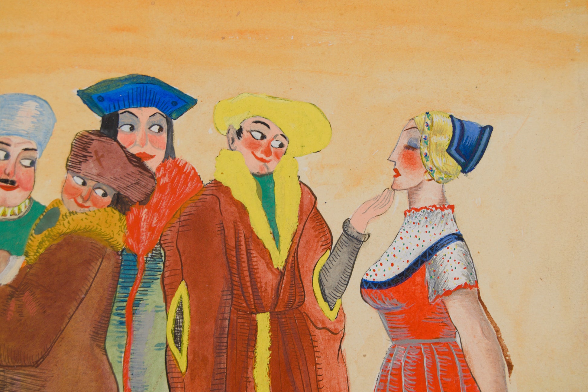Sin embargo, la obra dista mucho de ser un panfleto complaciente; es una puesta en escena de una audacia satírica tremenda. A la izquierda, el artista agrupa un bloque compacto que representa a las clases dominantes o los "poderes fácticos". Estos seis personajes están representados con una opulencia casi grotesca y teatral: envueltos en abrigos de pieles tan densos que parecen armaduras, y tocados con una ecléctica variedad de sombreros históricos y burgueses. Sus rostros oscilan entre la complacencia, la burla y la altivez, celebrando el orden restaurado.