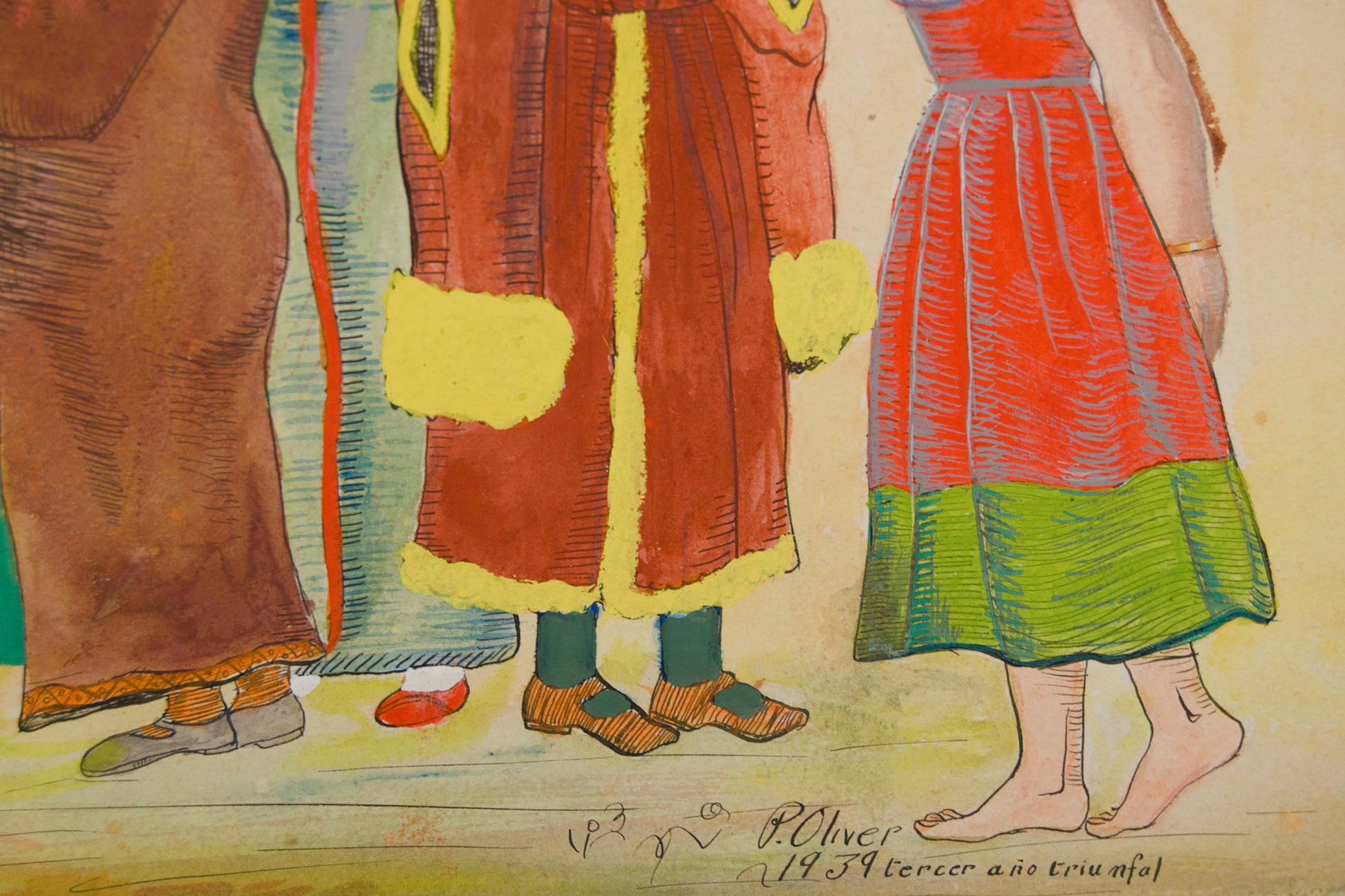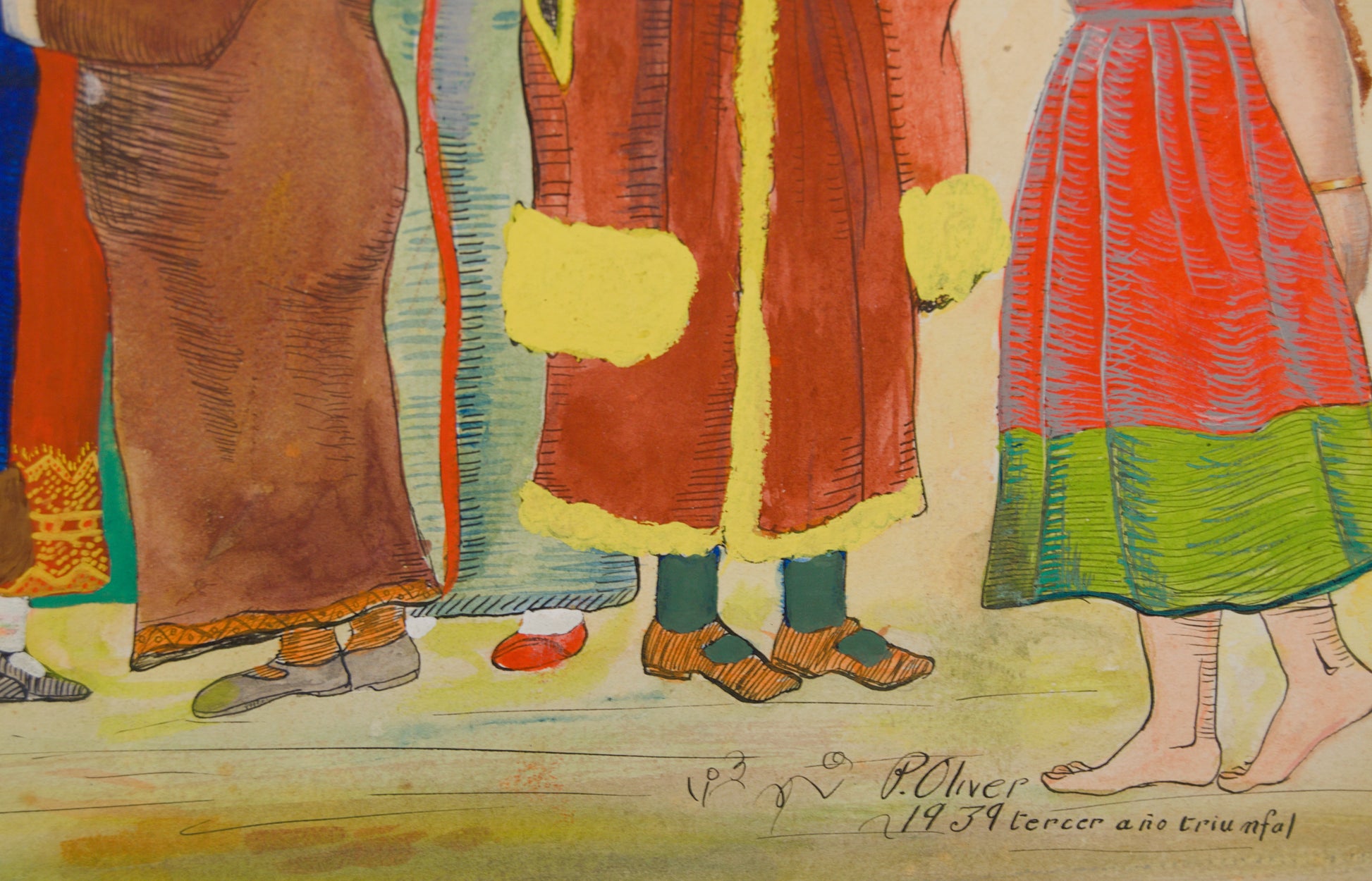 Firma e Inscripciones: Firmada y titulada a mano "P. Oliver / 1939 tercer año triunfal" en el ángulo inferior derecho.