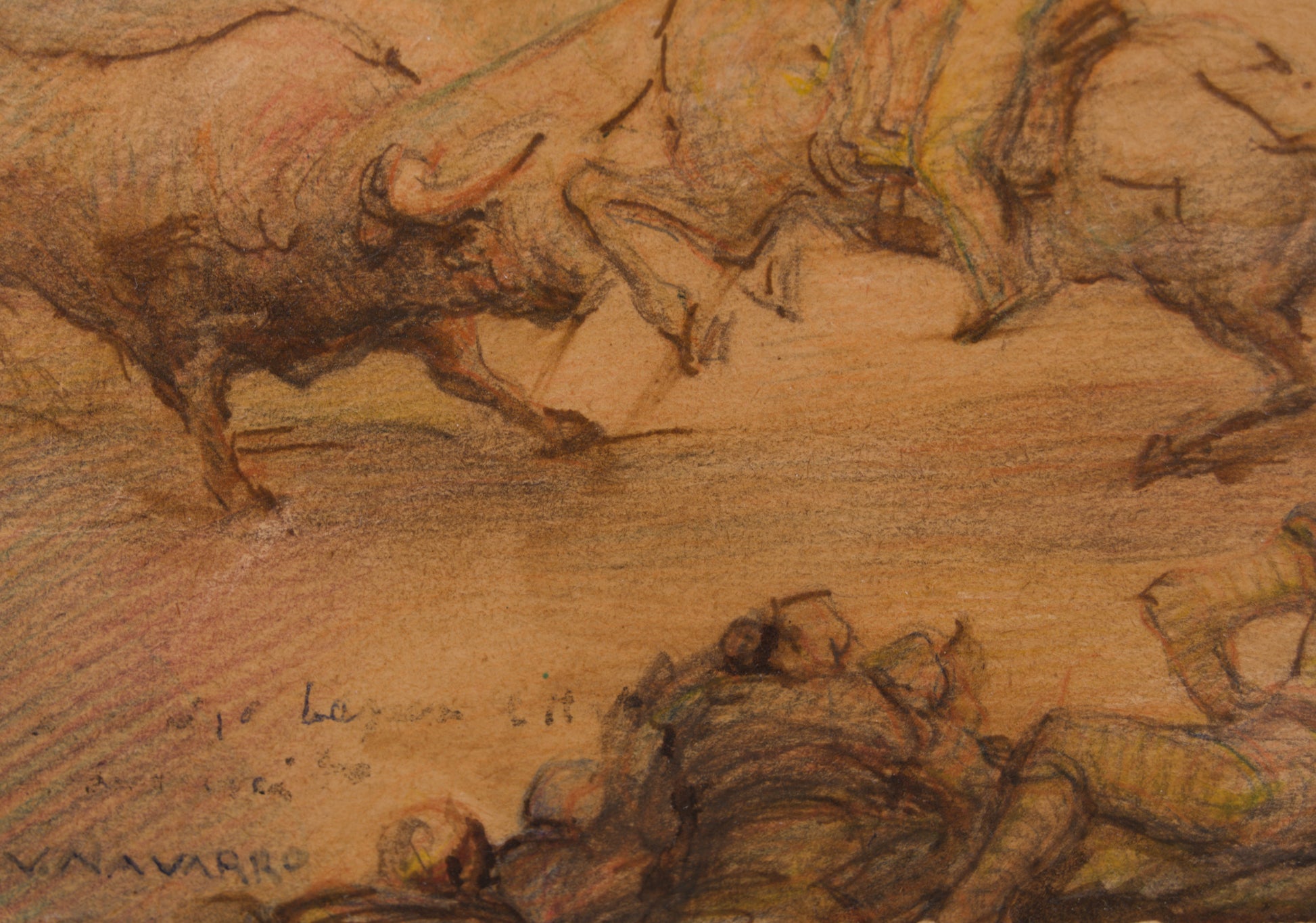 Con un trazo enérgico, nervioso y sumamente gestual, el artista dibuja al picador —perfectamente ataviado con su castoreño— aguantando la embestida del astado. En un magistral uso de la perspectiva y el encuadre, Navarro sitúa en primer término las figuras bocetadas de otros toreros recostados en la barrera, otorgando a la composición una profundidad casi fotográfica.
