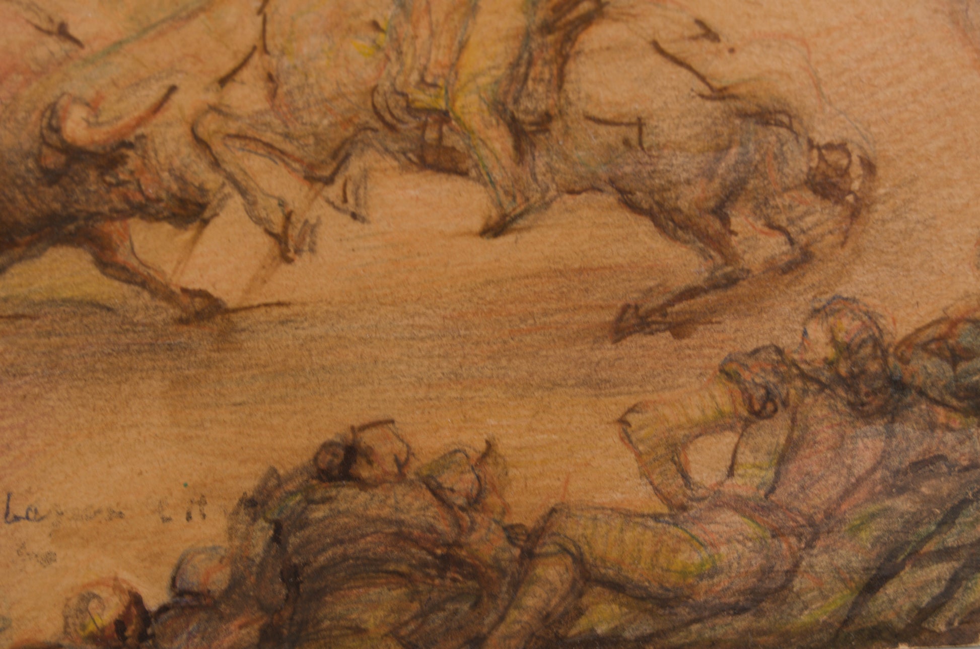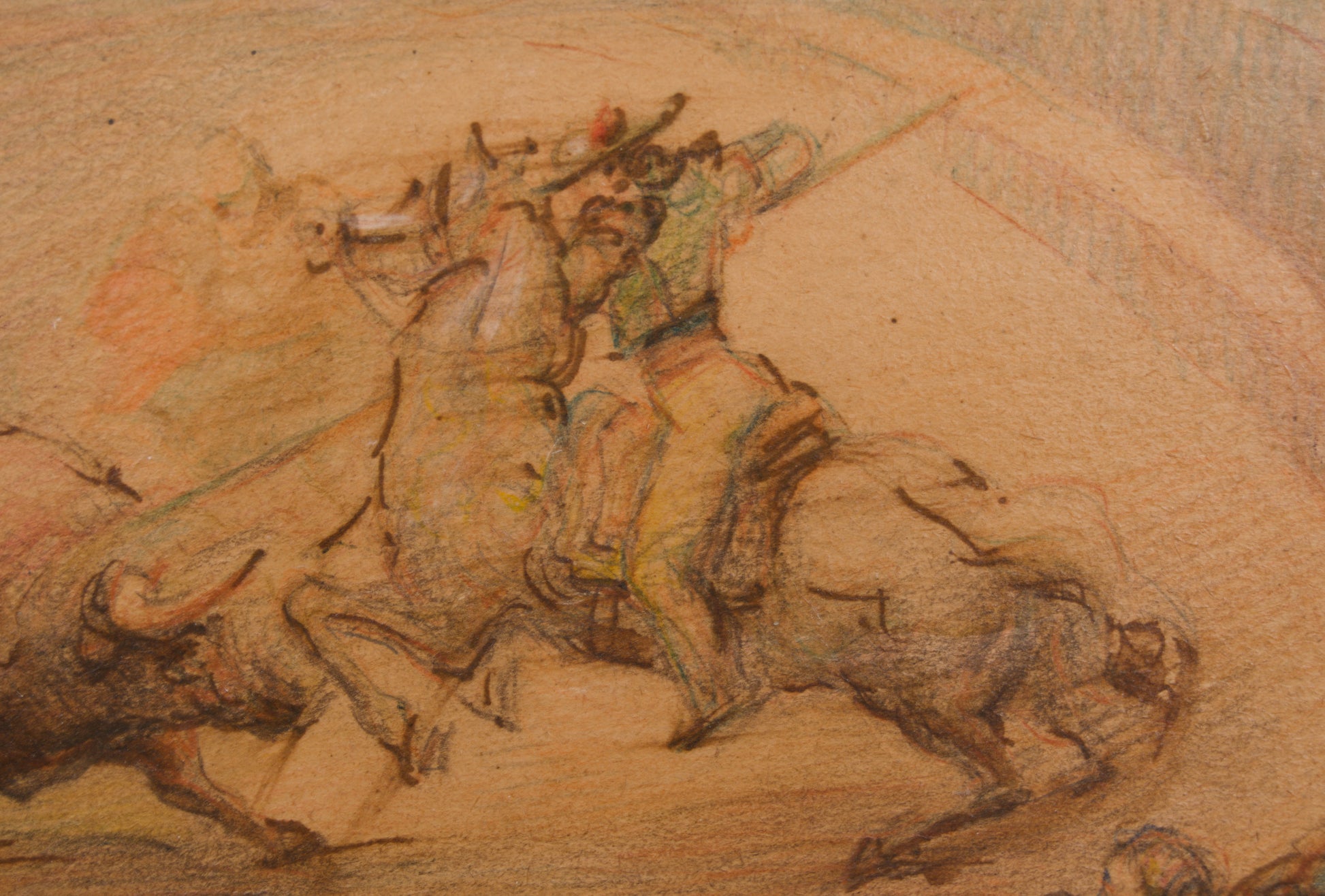 Lo que distingue a esta estampa y multiplica su interés para el coleccionista de obra gráfica es su inusual acabado. Sobre un dibujo rápido de técnica mixta (probablemente ceras, lápiz graso o pastel), el artista ha aplicado deliberadamente una densa capa de barniz. Esta decisión técnica no solo sella y protege la fragilidad del papel, sino que actúa como una lente óptica: satura dramáticamente la paleta de tonos tierra, terracotas y los destellos verdes de la chaquetilla del picador, creando un brillo profundo que emula la riqueza matérica de un óleo o una pieza de cerámica vidriada.